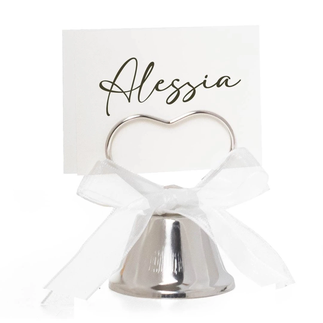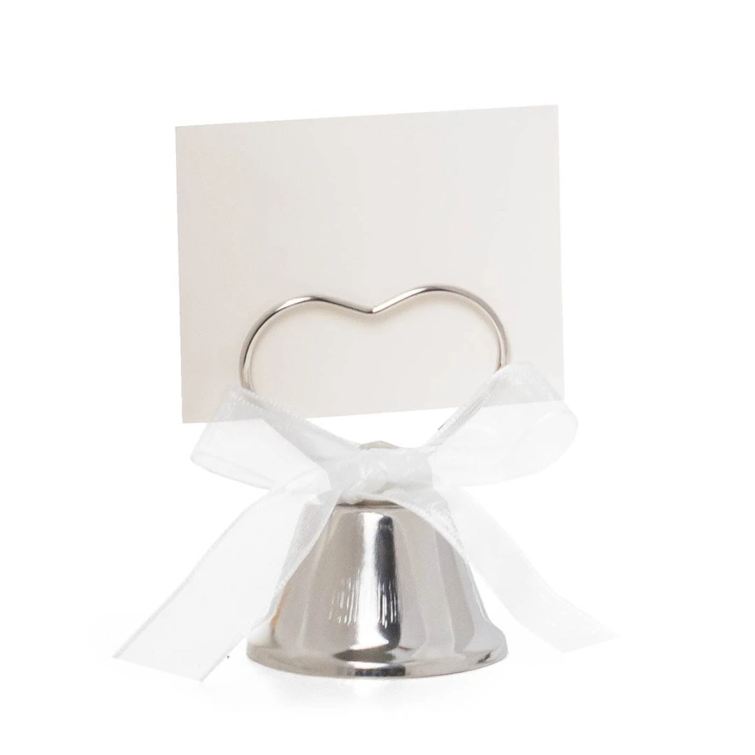 Le campanelle color argento sono dotate di supporto portabigliettino a forma di cuore, ideale per inserire il cartoncino con i nomi degli sposi, la data del matrimonio o un piccolo messaggio dedicato agli invitati. Il delicato fiocco in nastro bianco dona un tocco elegante e raffinato, perfetto per cerimonie e ricevimenti.