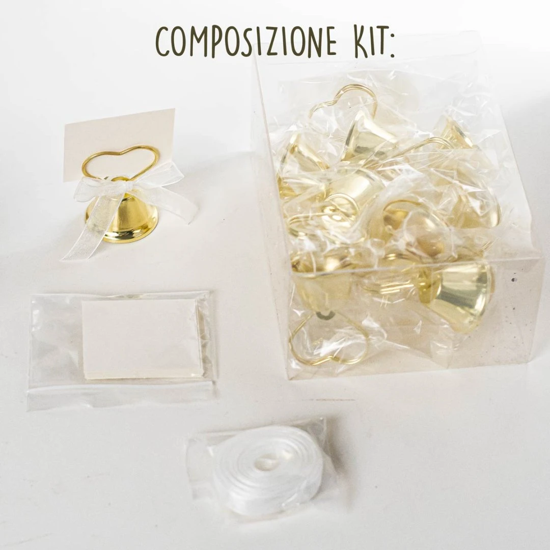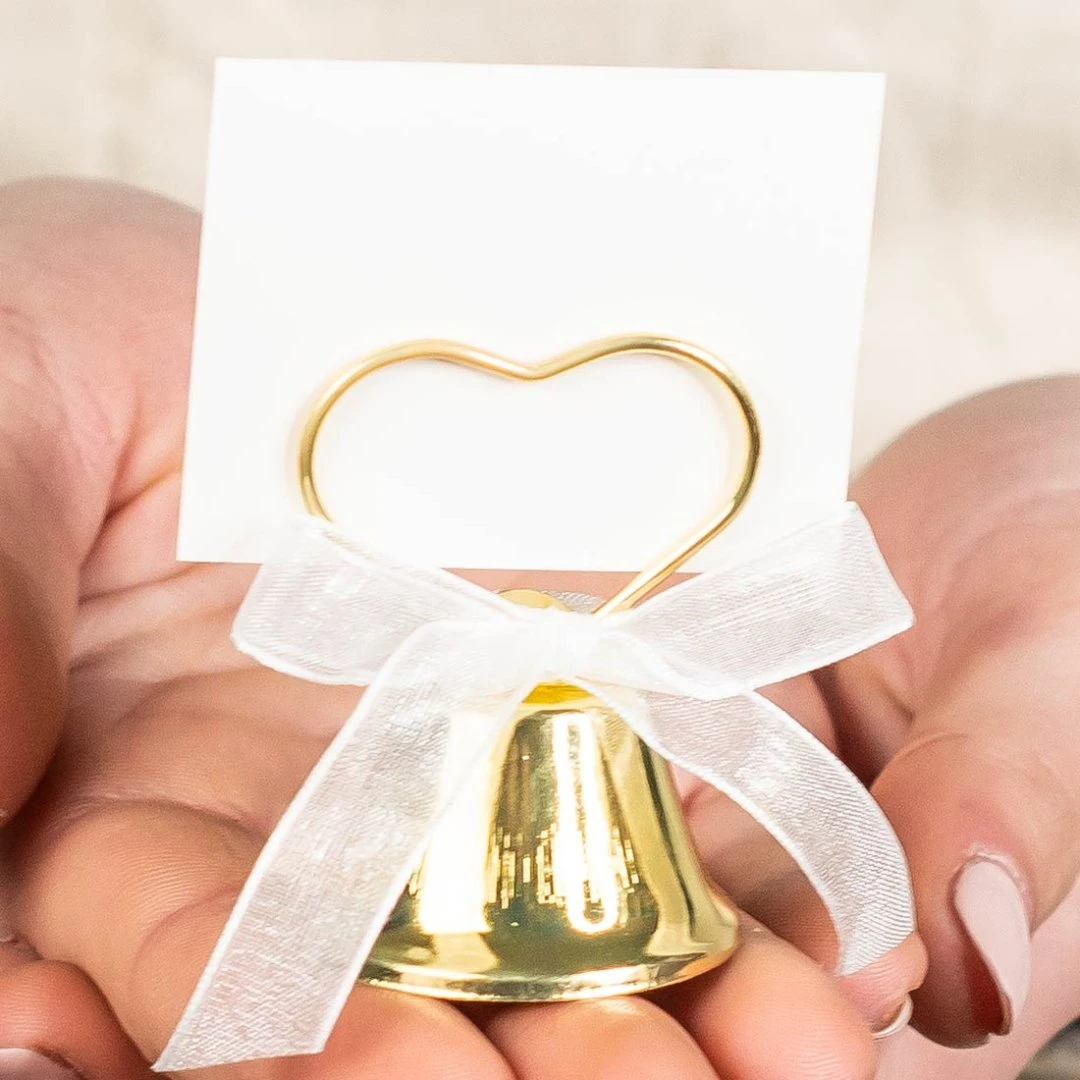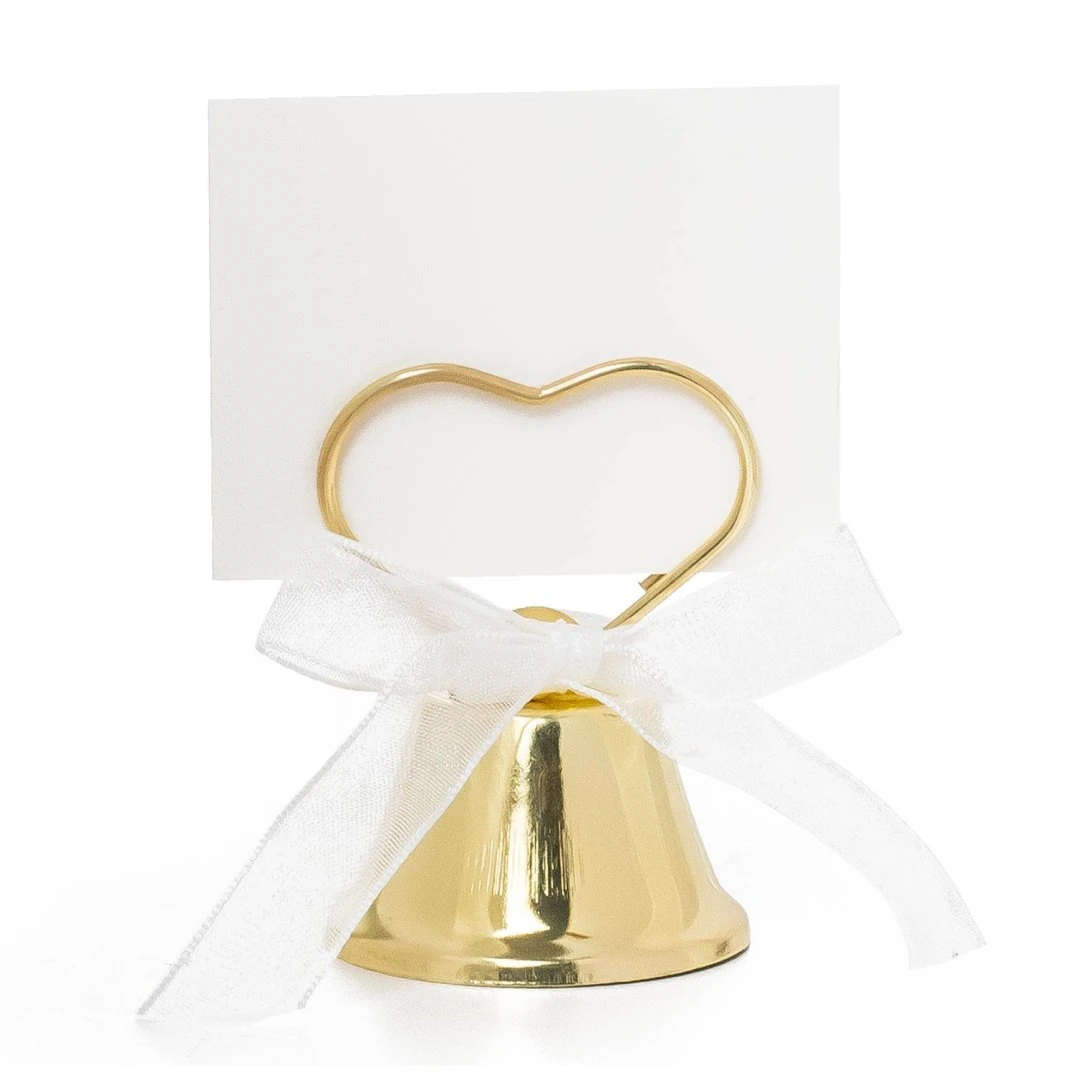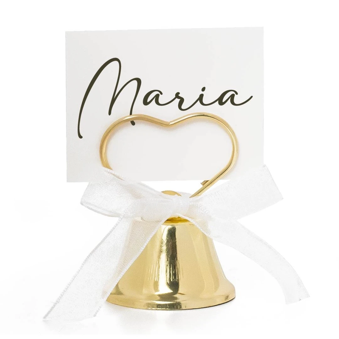 Le campanelle color Oro sono dotate di supporto portabigliettino a forma di cuore, ideale per inserire il cartoncino con i nomi degli sposi, la data del matrimonio o un piccolo messaggio dedicato agli invitati. Il delicato fiocco in nastro bianco dona un tocco elegante e raffinato, perfetto per cerimonie e ricevimenti.