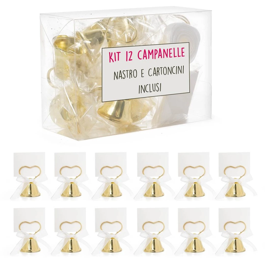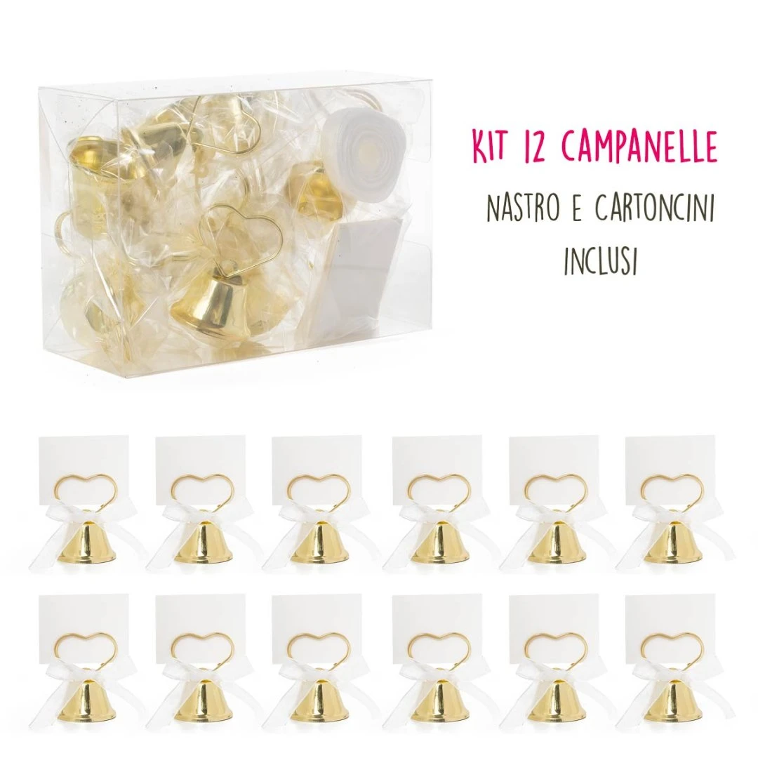 Kit da 12 campanelle tirabaci matrimonio color Oro con 12 cartoncini portabiglietto e rotolino di nastro inclusi. Perfette per coinvolgere gli invitati durante il taglio della torta o i momenti di festa. Campanella 3,5×3,5 cm (h 5 cm), cartoncino 5×4 cm, Vedi anche la campanella Argento