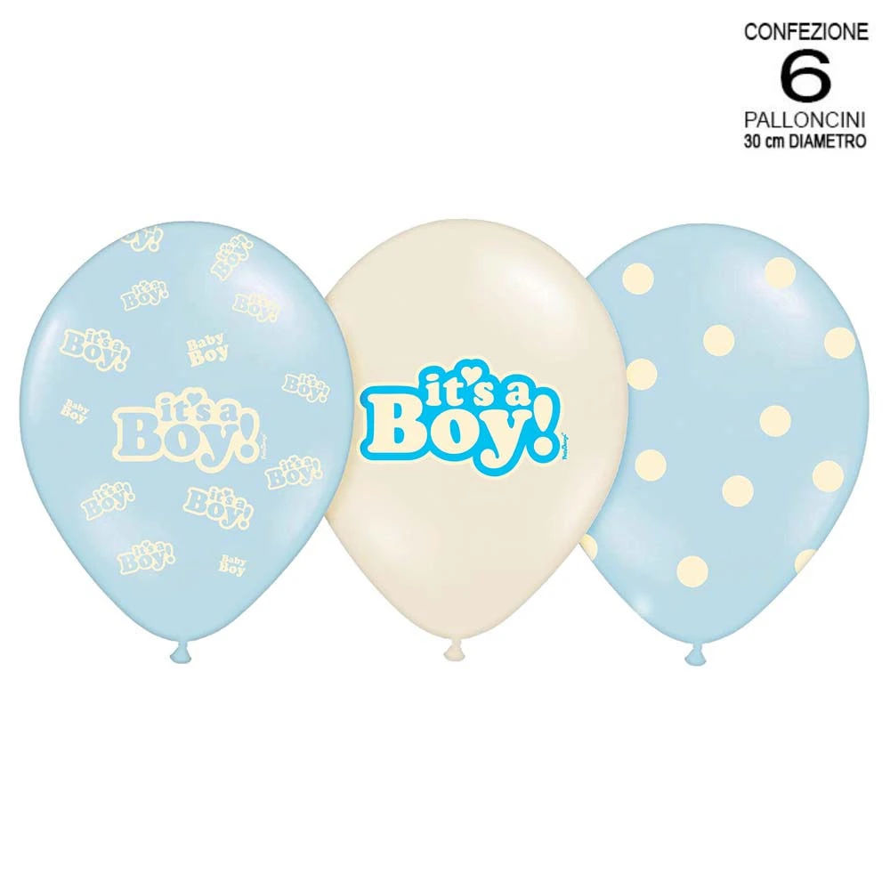 conf. 6 palloncini celesti con "It's a Boy" con pois assortiti per battesimo e nascita 30 cm, prezzo per confezione da 6 pezzi