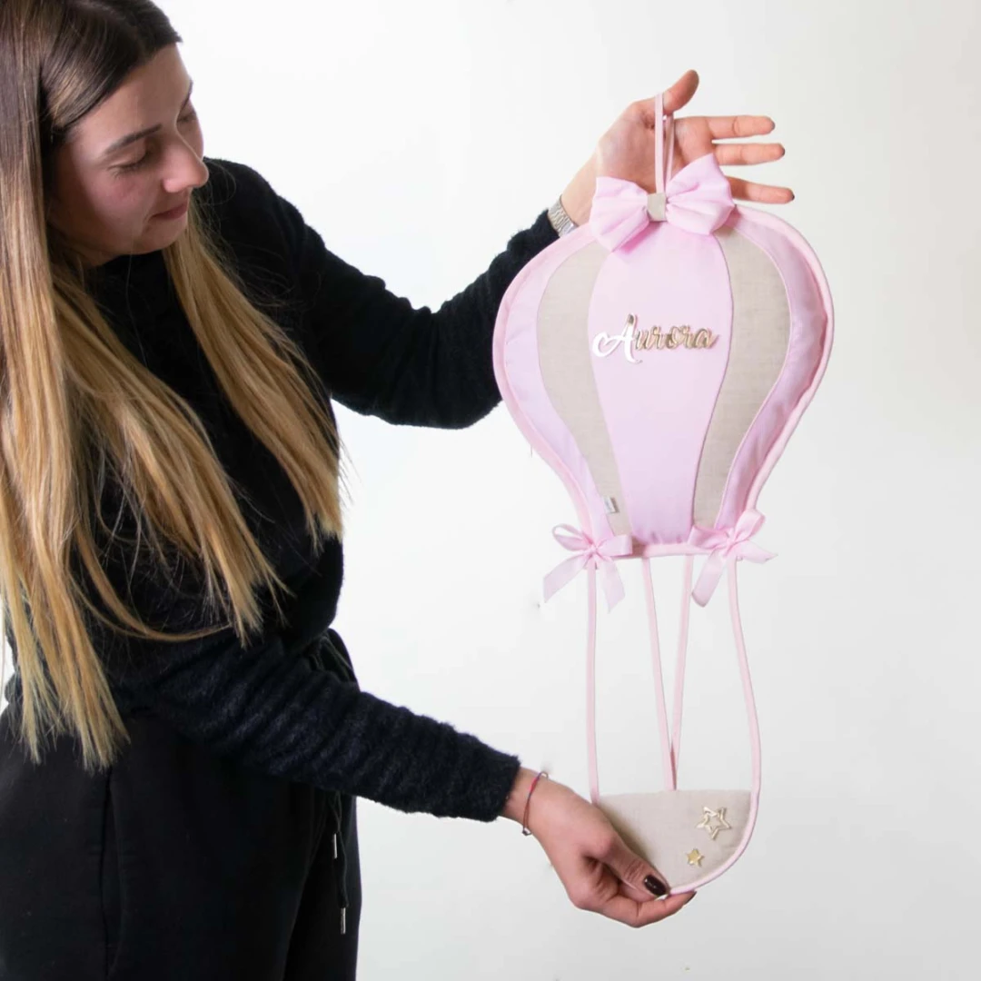 Fiocco nascita bimba mongolfiera in cotone colore rosa e beige, articolo di altissima qualità made in italy, completo con nome personalizzato, misura 55x26 cm;