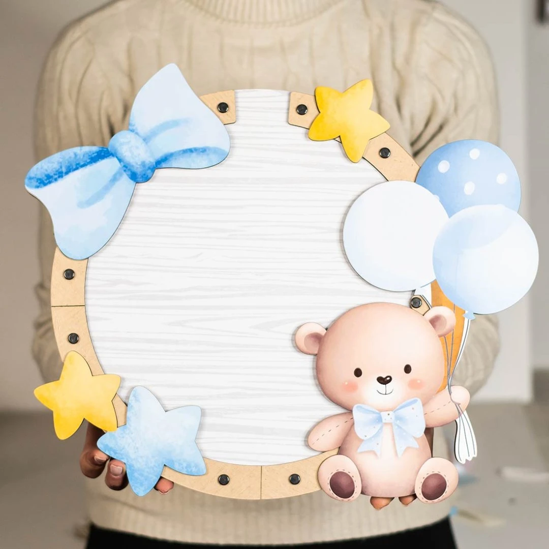 La struttura è realizzata in legno e plexiglass ed è decorata con un tenero orsetto con palloncini, fiocco e stelline nei toni dell’azzurro. Sul palloncino è possibile inserire il nome del bimbo per rendere il guest book ancora più personale e speciale.