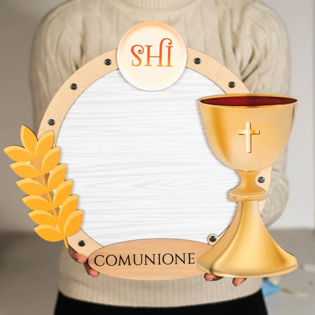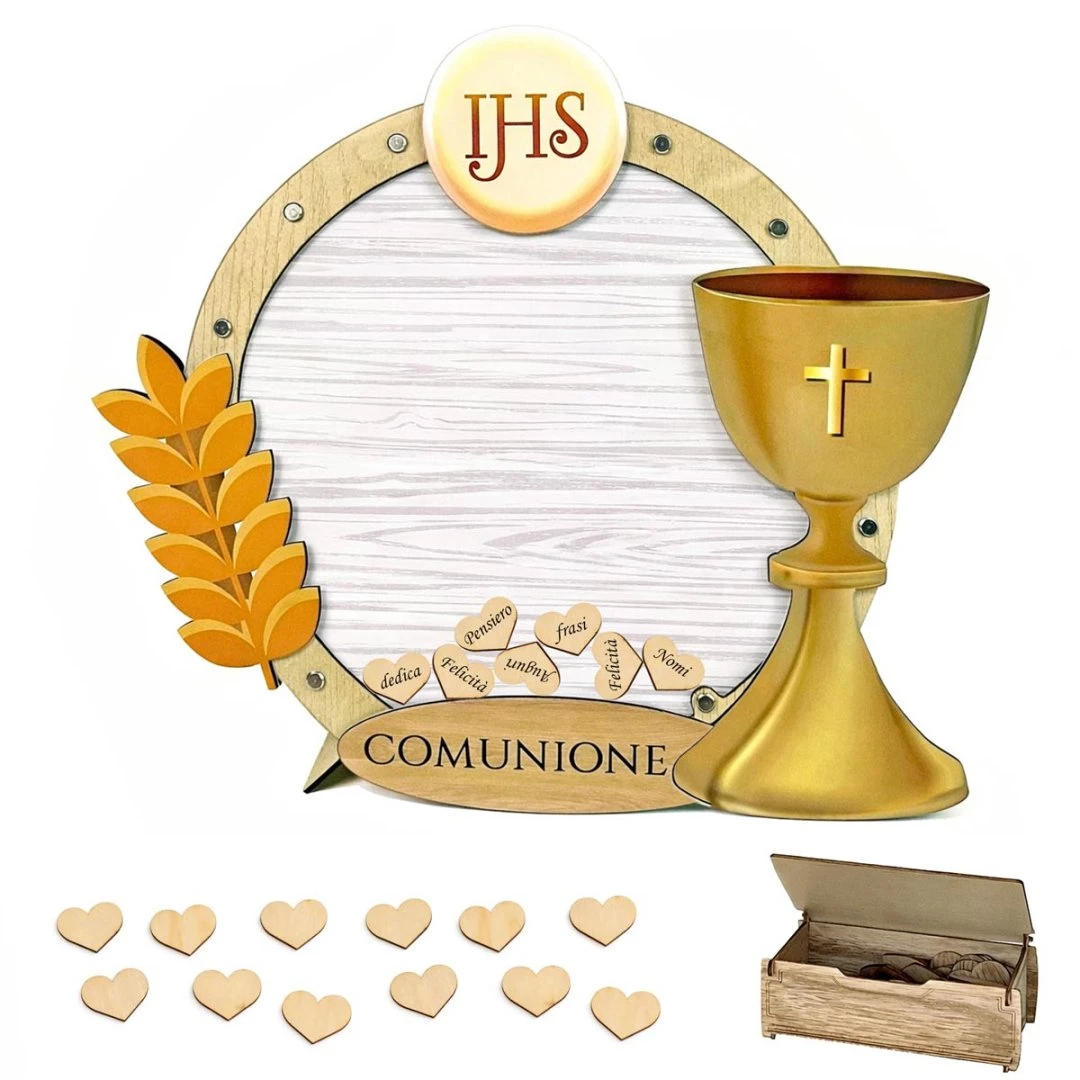 La struttura è realizzata in legno e plexiglass ed è arricchita da simboli della Prima Comunione come il calice con croce, la spiga di grano e il simbolo IHS. Nella parte inferiore è presente una targa personalizzabile con nome e data oppure con la scritta Comunione.