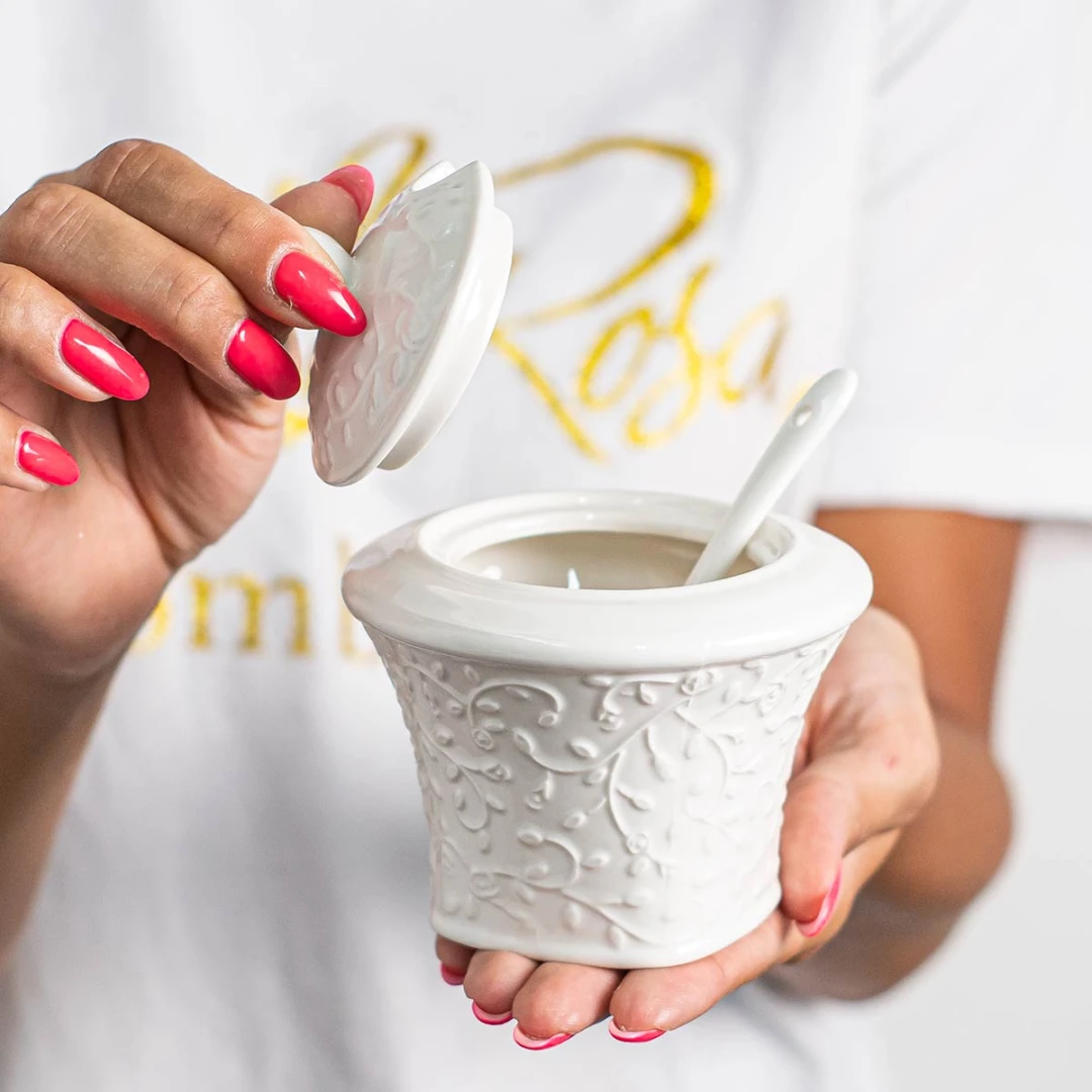 Collezione Linea Botanic Plus HERVIT, Zuccheriera in porcellana con cucchiaino, prodotto di altissima qualità. misura: Ø 10 x 10 cm.