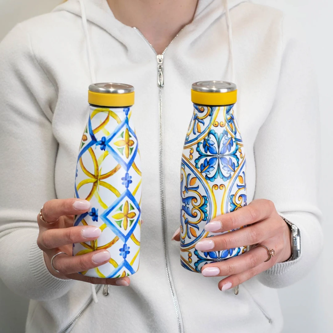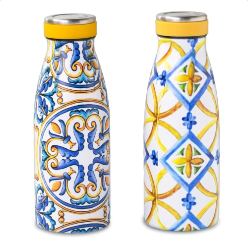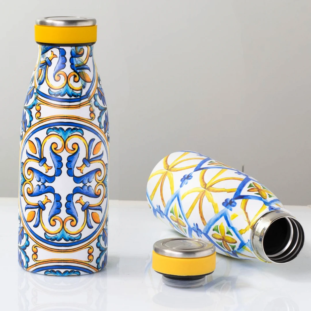 Bomboniere Maioliche borraccia in metallo termica con decori maioliche, articolo di tendenza eco-solidale , misura 7x7x18 cm, capienza 350 ml. arriva misto nei 2 colori, prezzo per 1 pezzo.