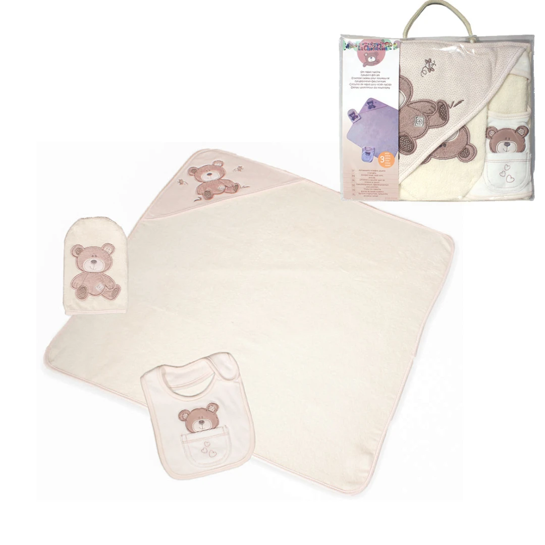 Kit regalo 3 pz comprende Asciugamano con cappuccio 76x76 cm, guanto per bagno e bavaglio 22x14 cm, materiale 100%cotone, con orsetto ricamato.