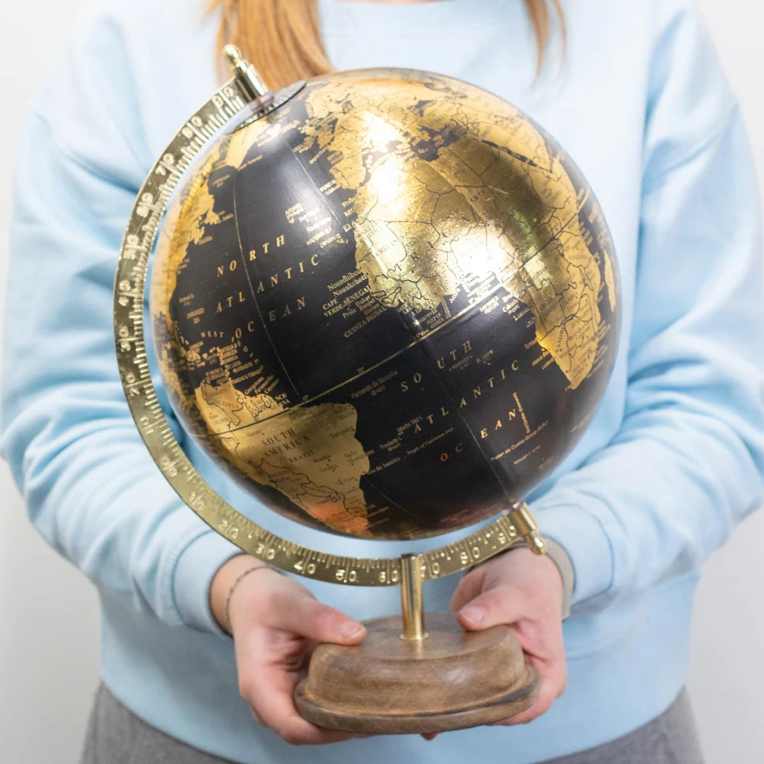 Mappamondo tema viaggio vintage oro e nero idea regalo, o per matrimonio a tema viaggio, misura 27x27x39 cm,