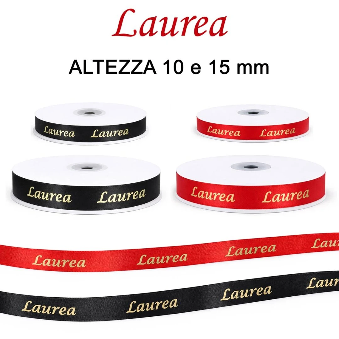 Elegante nastro in raso con scritta “Laurea” stampata in oro, perfetto per confezionare bomboniere, sacchetti, pergamene e decorazioni per feste di laurea. Il raso lucido valorizza la stampa dorata creando un effetto raffinato e celebrativo.