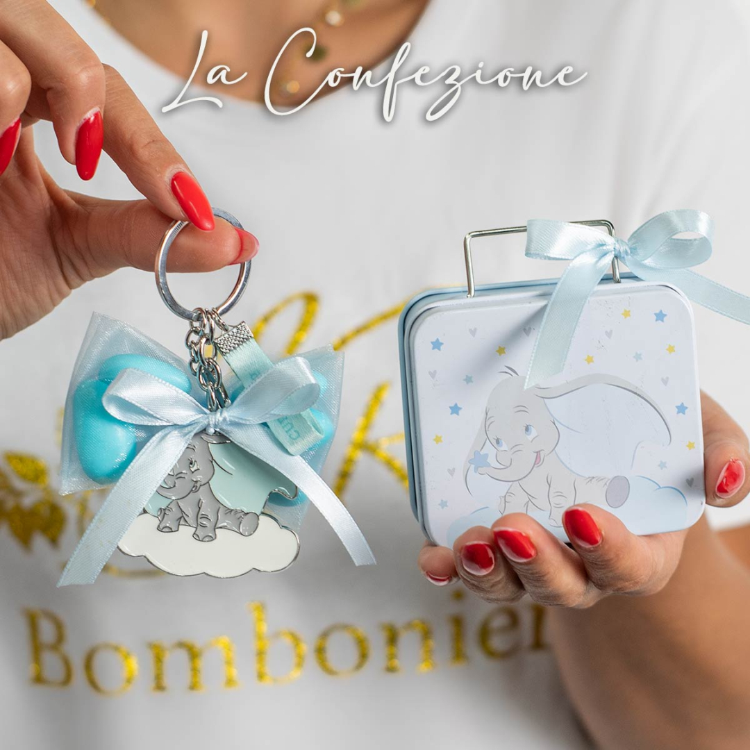 Collezione Linea Disney Baby, Portachiavi in metallo decorato, Dumbo seduto su una nuvola bianca, con le grandi orecchie aperte e un'espressione dolce e tenera. Dumbo tiene una stellina blu con la proboscide. Il design complessivo è delicato e dolce, con colori tenui come l'azzurro e il bianco. Perfetta per celebrare momenti speciali con un tocco di magia Disney. Misura: 10 x 5 cm. La scatolina è inclusa solo con la confezione. Se vuoi anche la scatolina a parte la trovi qua.