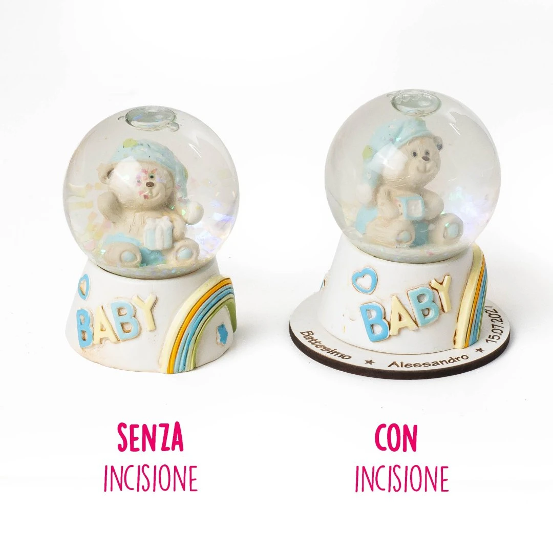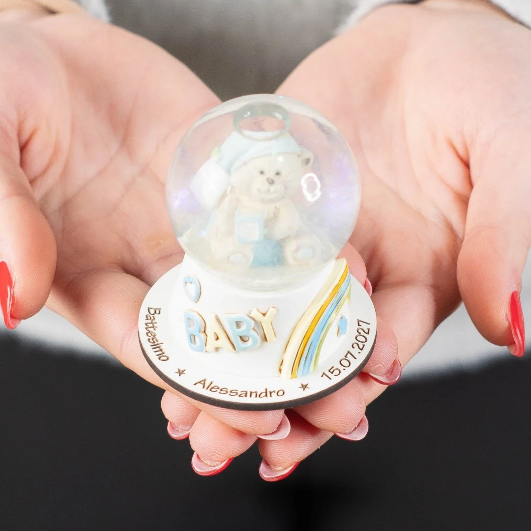 ⚡PROMO LAMPO Bomboniere battesimo e nascita originali per maschio, collezione 2026, sfere con neve brillante, con all'interno orsetto in pigiama celeste con giocattolo e scritta baby frontale, puoi personalizzare la bomboniera aggiungendo la base incisa con il nome! misura: Ø 4,5 cm | h 6,5 cm. | Ø con base incisa: 5,3 cm.