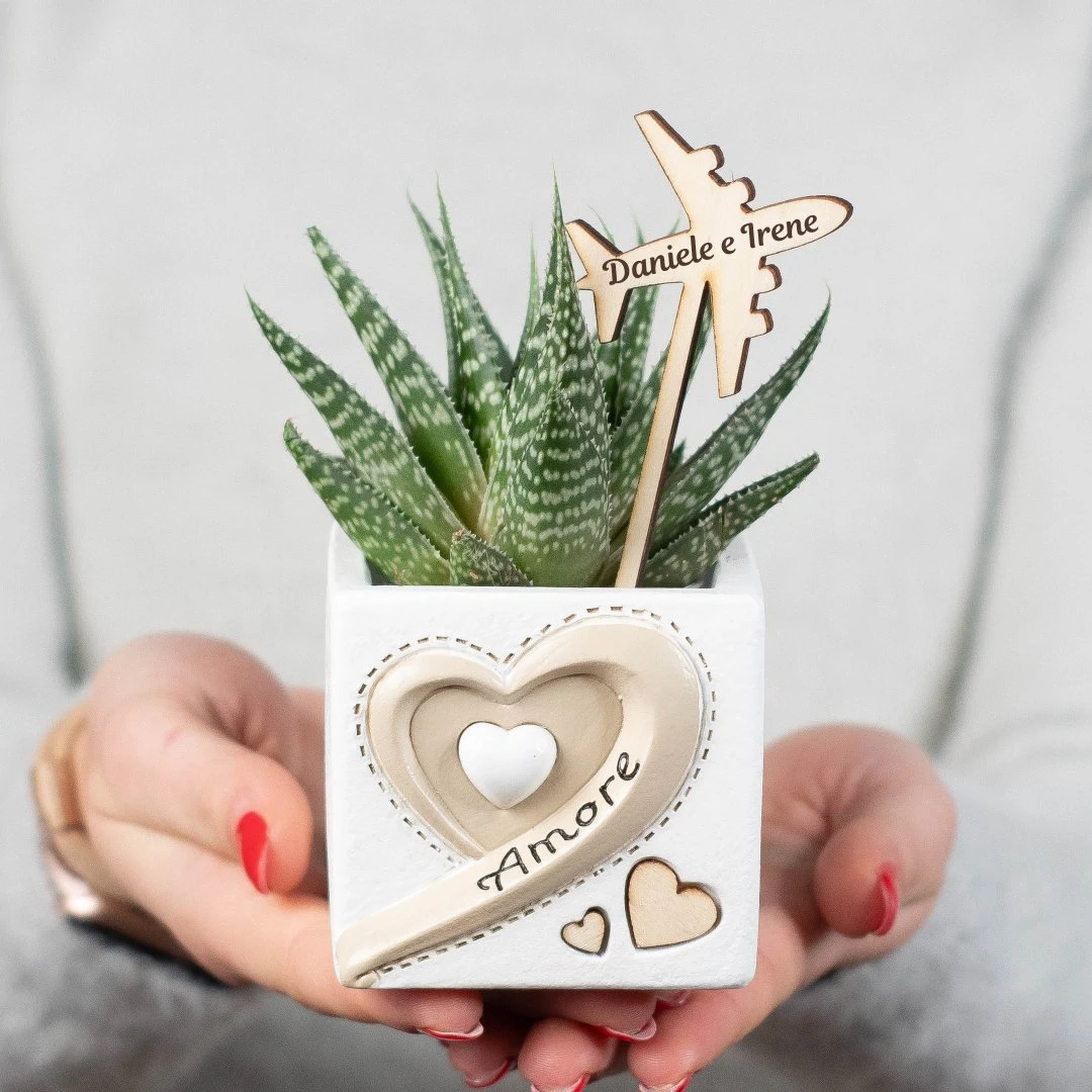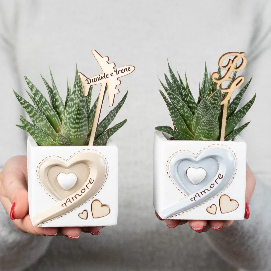 Bomboniere Portapiantina in resina colorata con cuore, tratteggio e cuoricini in legno di decoro. Arriva in due colori assortiti. Misura: 7,2 x 7,2 cm | h 6,5 cm. Prodotto Artigianale. Prezzo cadauno.