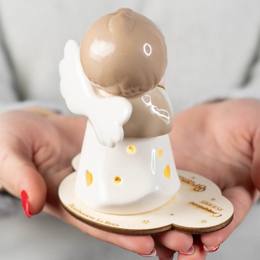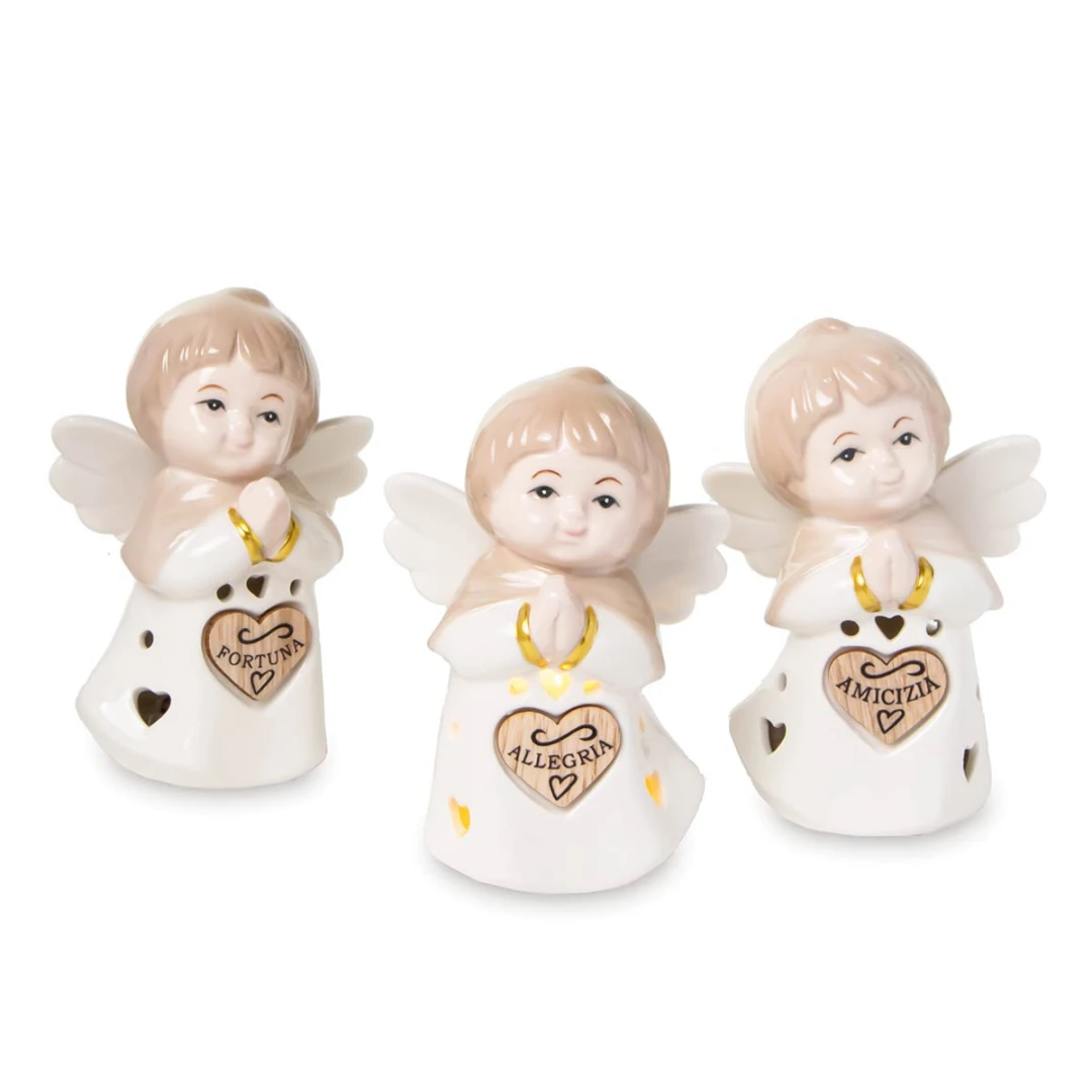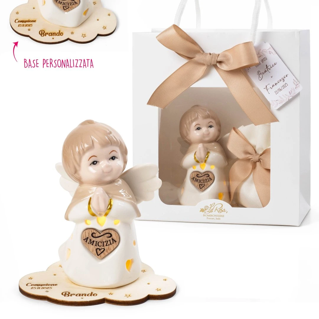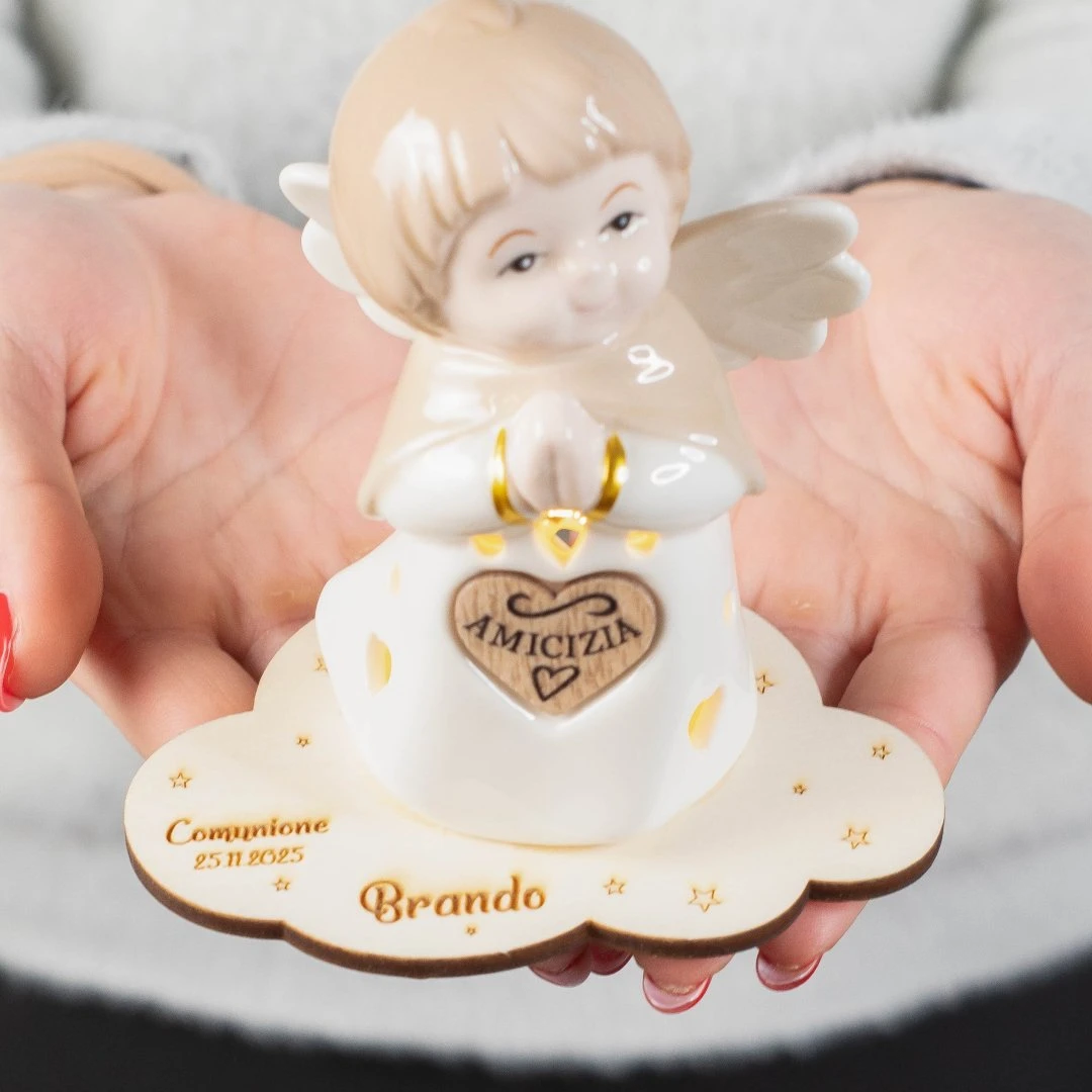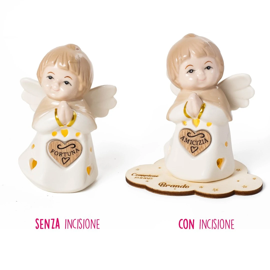 ⚡PROMO LAMPO Bomboniera Angioletto in preghiera e cuore in legno con testo: "Amicizia" "Allegria" e "Fortuna" in porcellana. Arriva assortito nelle 3 varianti citate. La base personalizzata non è inclusa, può essere aggiunta con un supplemento. misura: 8 x 5 cm | h 11 cm. misura con base personalizzata: 11 x 7,5 cm | h 12 cm.