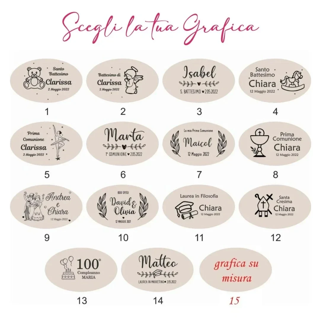 Il colore del testo e disegno sarà abbinato alla cerimonia, es. Laurea rosso, Battesimo rosa o celeste ecc..
