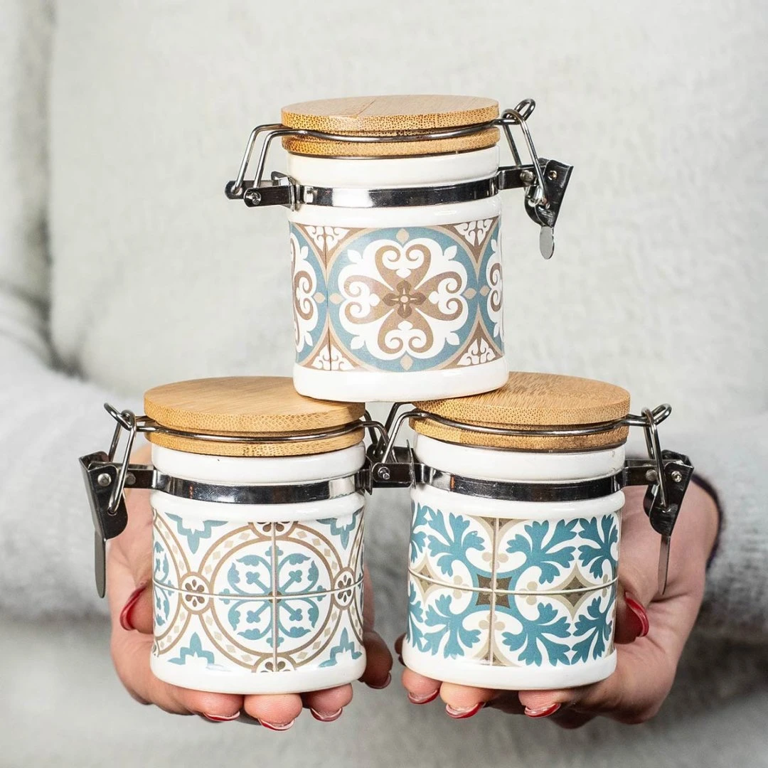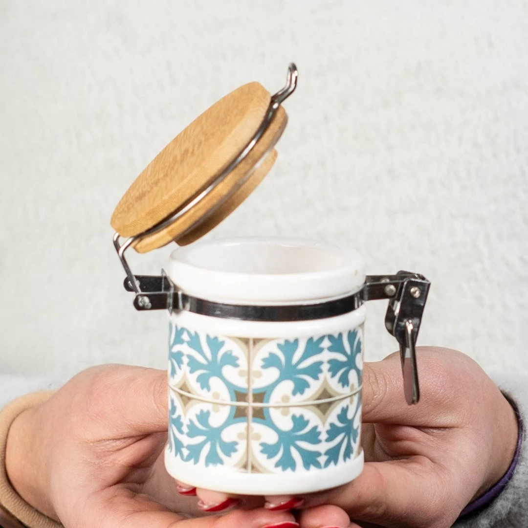 Bomboniere Barattoli Ermetici in porcellana con decoro maioliche e Legno. Arrivano assortiti in 3 varianti. Misura: 7,5 x 5,8 cm | h 9 cm. Prodotto Artigianale. Prezzo cadauno.