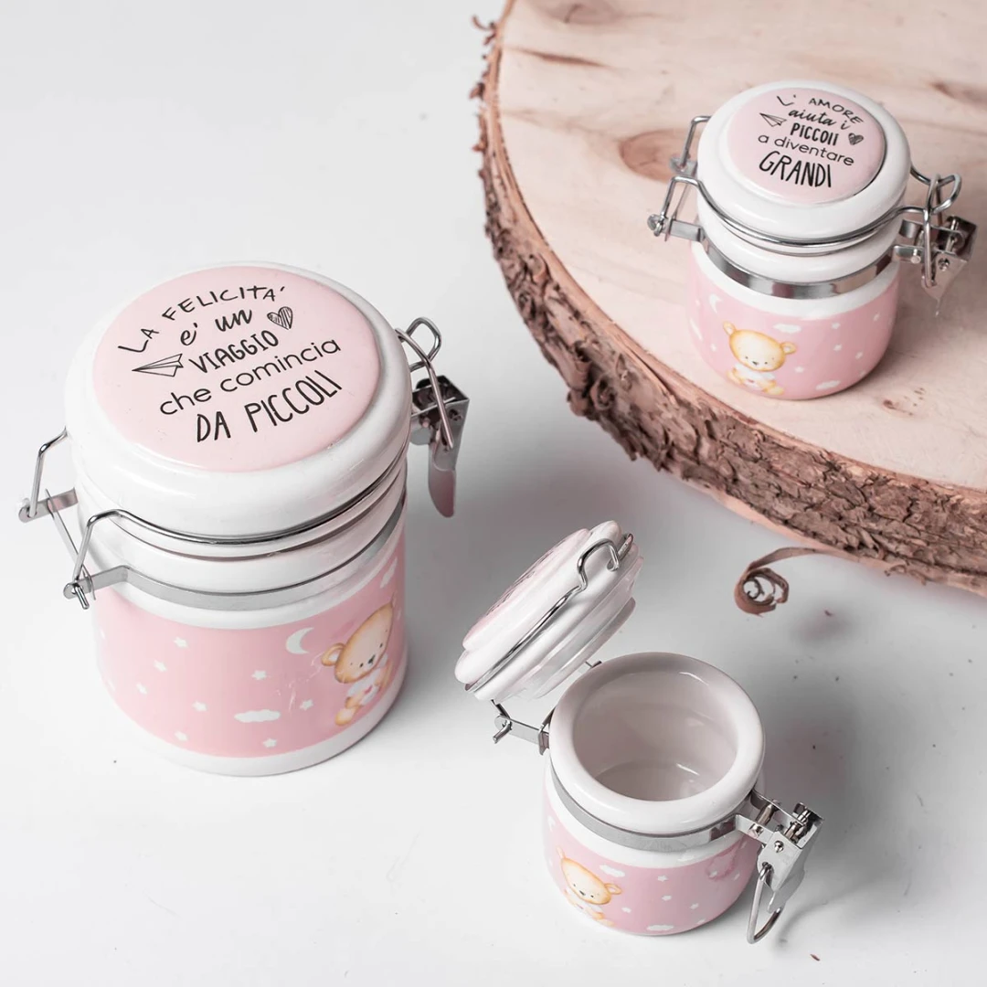 Bellissime Bomboniere 2026 per Battesimo e Nascita Bimba, Linea Baby Box, Barattolini ermetici rosa in porcellana con orsetto e decoro frase su coperchio "L'amore aiuta i piccoli a diventare GRANDI". La versione Standard include il cucchiaino. Prezzo cadauno. Prodotto Artigianale.