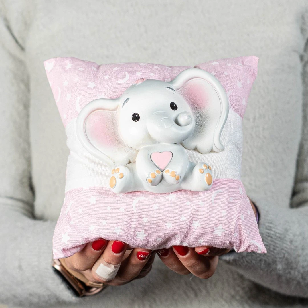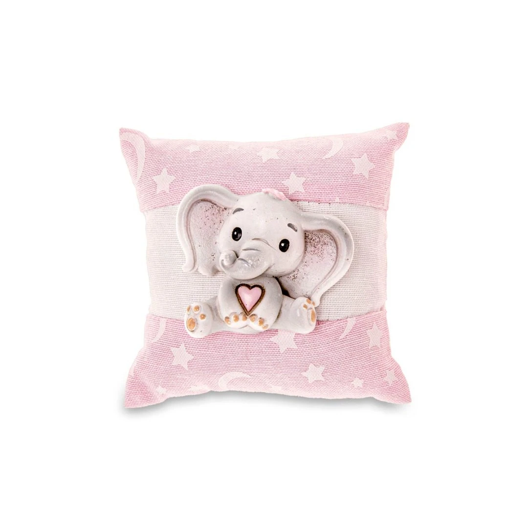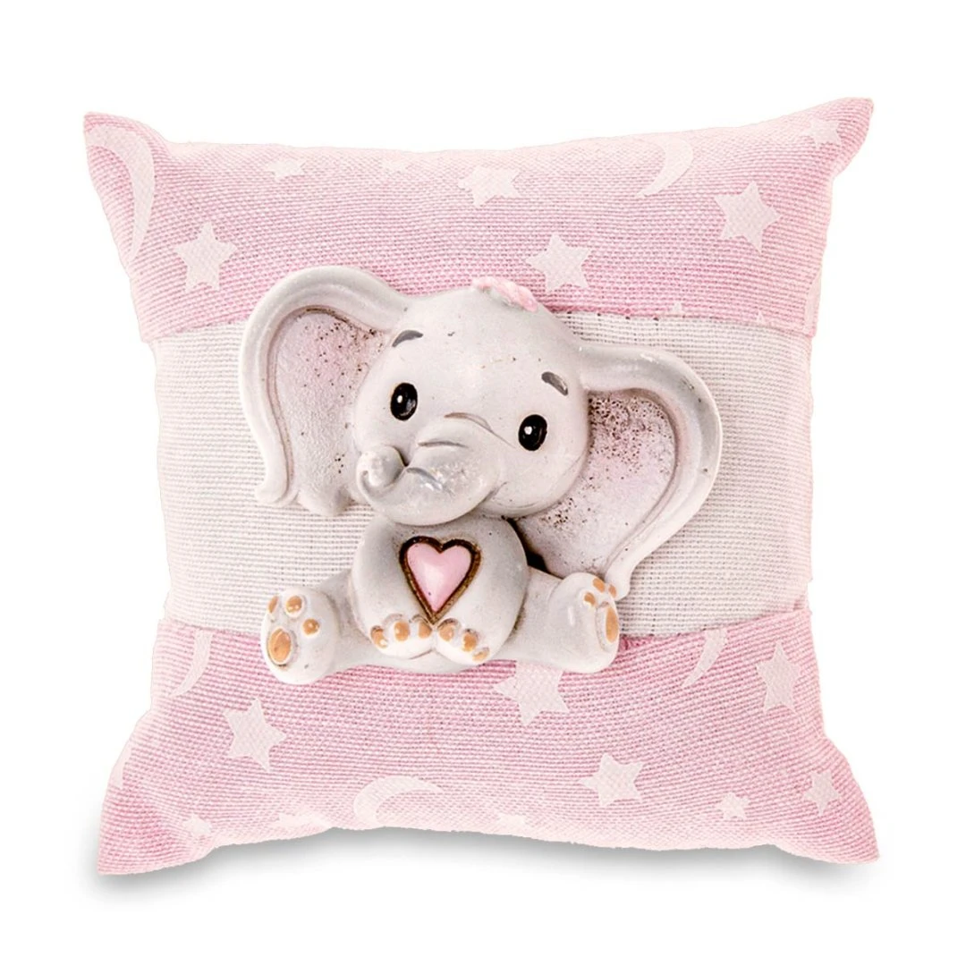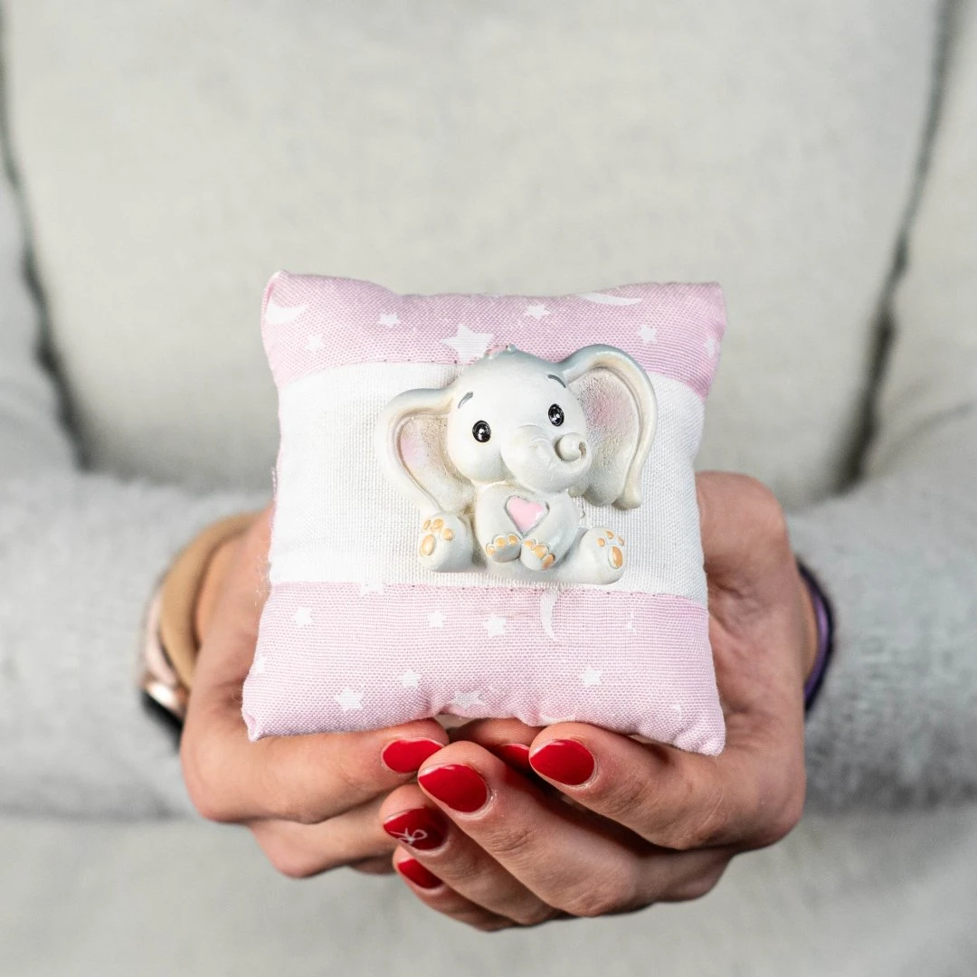Bomboniere Battesimo e Nascita Femmina linea neve Cuscini Rosa decorati da stelline e lune bianche con fascia ed elefantino in resina colorato sul fronta. Disponibili due dimensioni. Prodotto Artigianale. Prezzo cadauno.