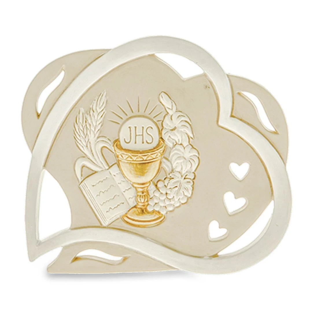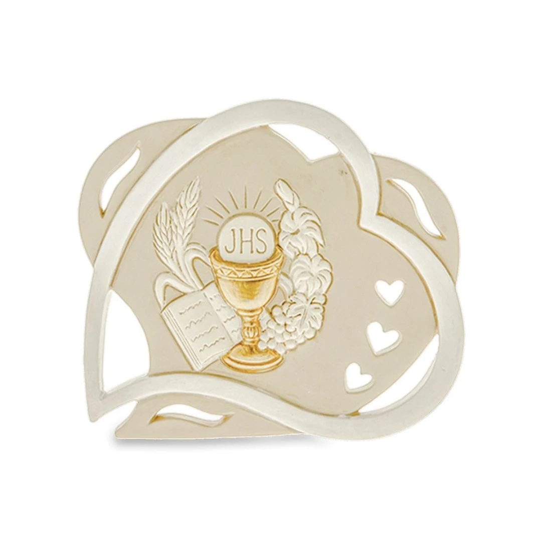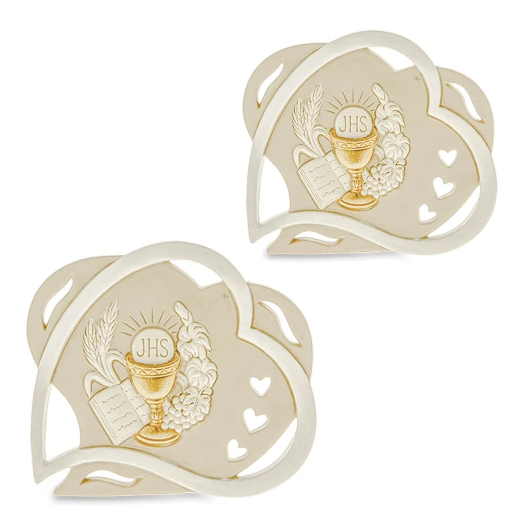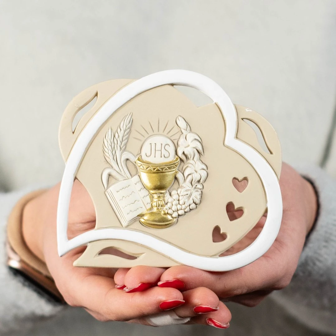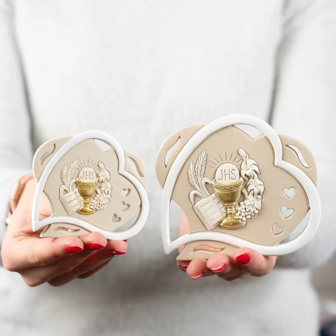 Bomboniera per Comunione, Icona da appoggio a forma di doppio cuore con entrambi i simboli, materiale resina decorata a mano. Disponibili 2 dimensioni. Prodotto Artigianale. Prezzo cadauno.