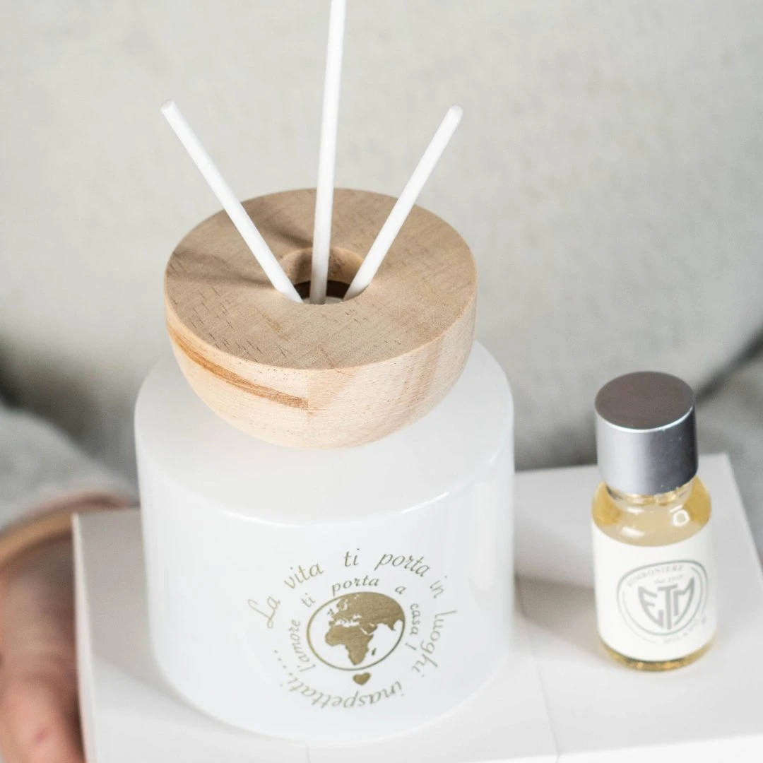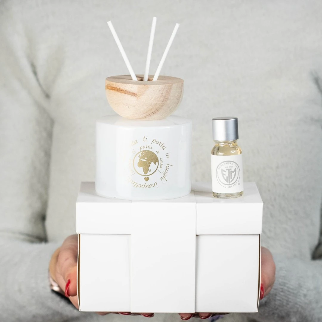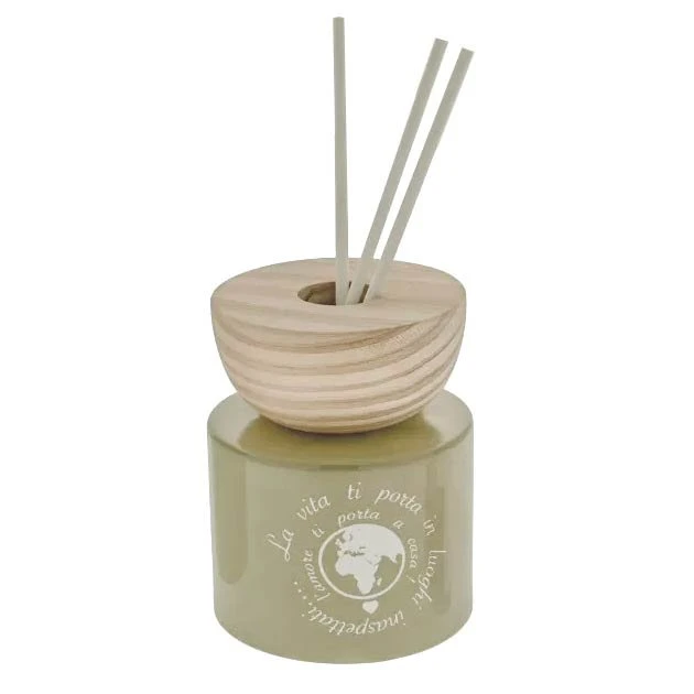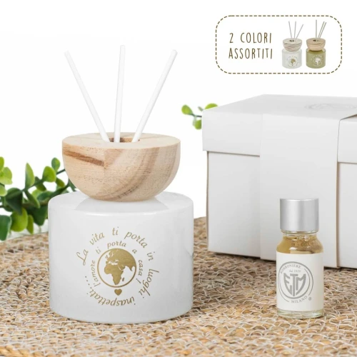 Bomboniere Profumatore Tema Viaggio con Mondo e frase " La vita ti porta in luoghi inaspettati... l'amore ti porta a casa! " in vetro e legno. Arriva completo di scatola, bacchette e profumo. Inoltre arriva assortito nei 2 colori mostrati (Bianco e Verde). Misura: Ø 7,7 cm | h 9,5 cm | h con bacchette: 15,5 cm | Misura scatola: 14,5 x 10 cm | h 9 cm. Possibilità di aggiungere un bastoncino personalizzato.