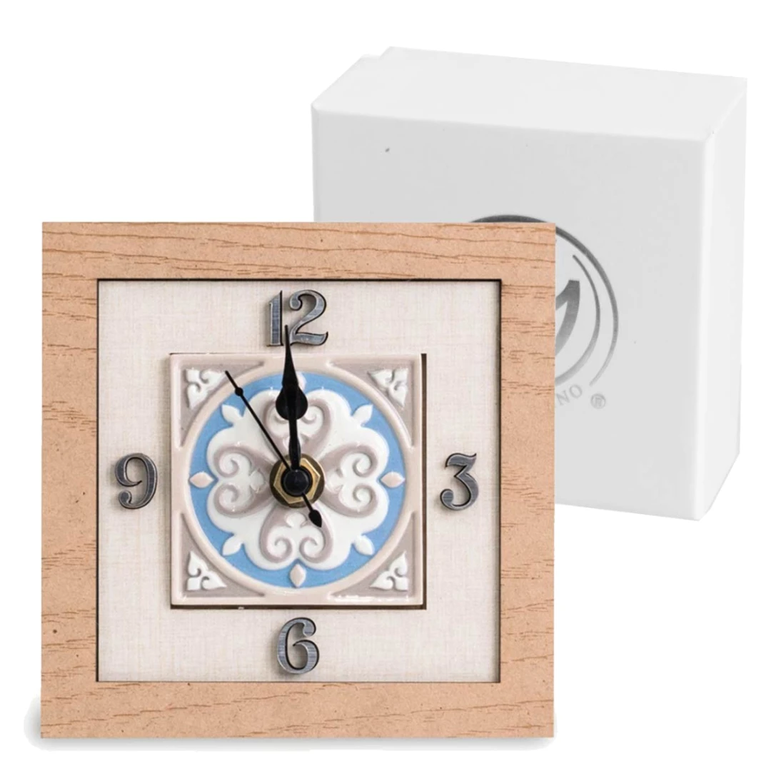 Bomboniere con maioliche 2026 in offerta stock, orologio da appoggio in legno con mattonella in ceramica decorata, compreso di scatola rigida, misura 13x13 cm.