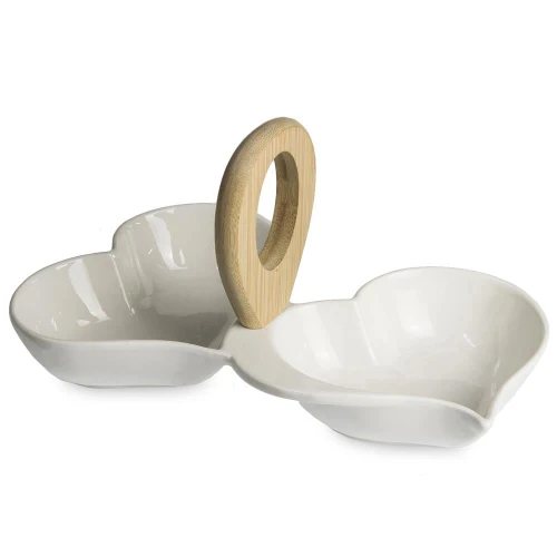 Bomboniere Utili 2026 Antipastiera Doppio Cuore in Porcellana bianca e Bamboo, Misura 23x13 cm