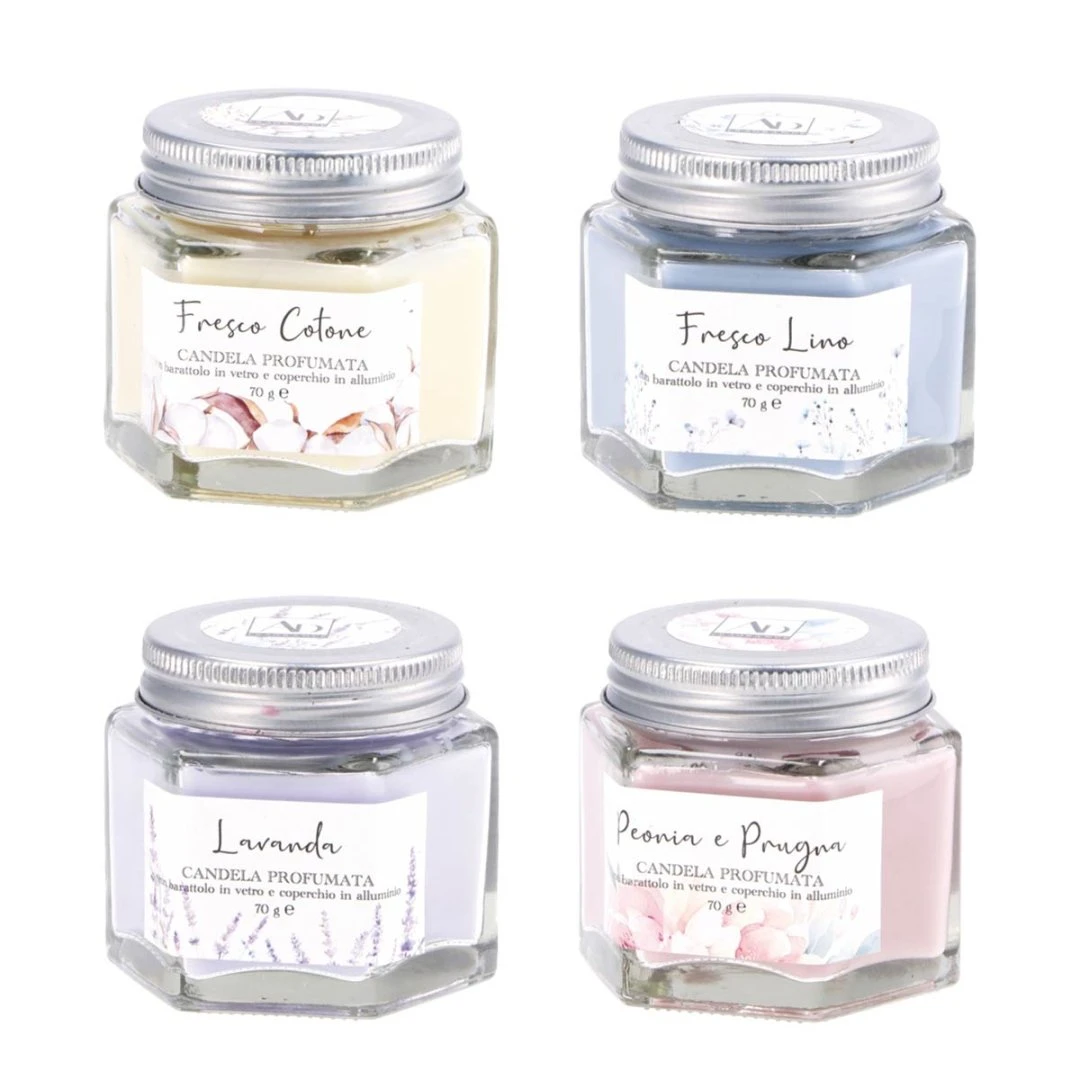 Candela profumata in barattolo di vetro con coperchio in alluminio, formato Ø 7 cm x h 6 cm: perfetta come bomboniera o segnaposto, arriva misto in 4 fragranze, prezzo cadauna.