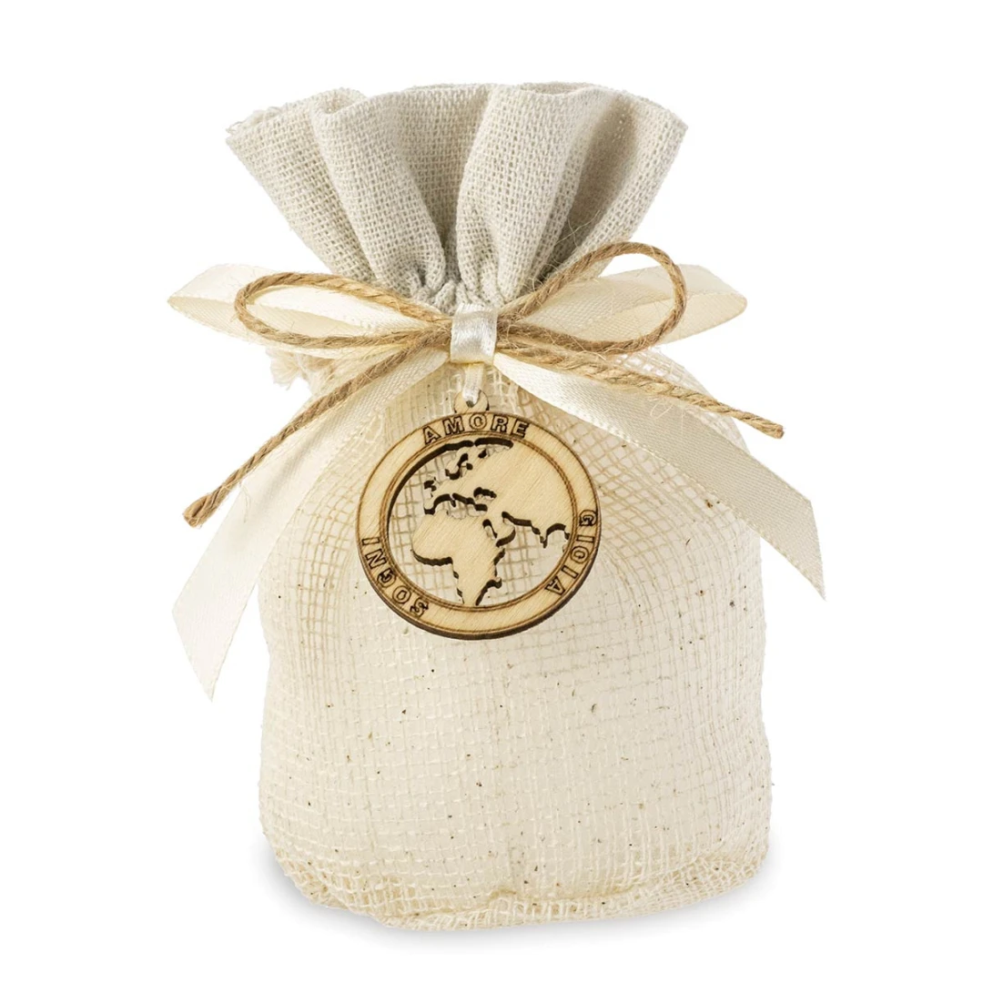 Sacchettini rustici idea orginale con ciondolo Tema Viaggio Amore, Gioia, Sogni. Completo di tirante di chiusura. Piatto: 10x12 cm | Tondo: 10 cm