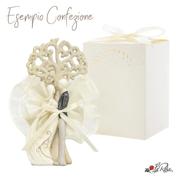 -CONFEZIONE: l'oggetto viene confezionato con doppio tulle, coccarda in tafta', confetti e biglietto stampato, il tutto scatolato con scatola avorio e legatura esterna.