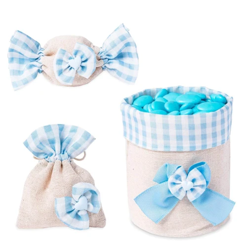 Sacchettini portaconfetti celesti rustici con fantasia quadretto e gessetto cuore. Completo di tirante di chiusura. Sacchettino: 8x10 cm | Caramella: 14 cm | Confettata: 12 cm h 14 cm.