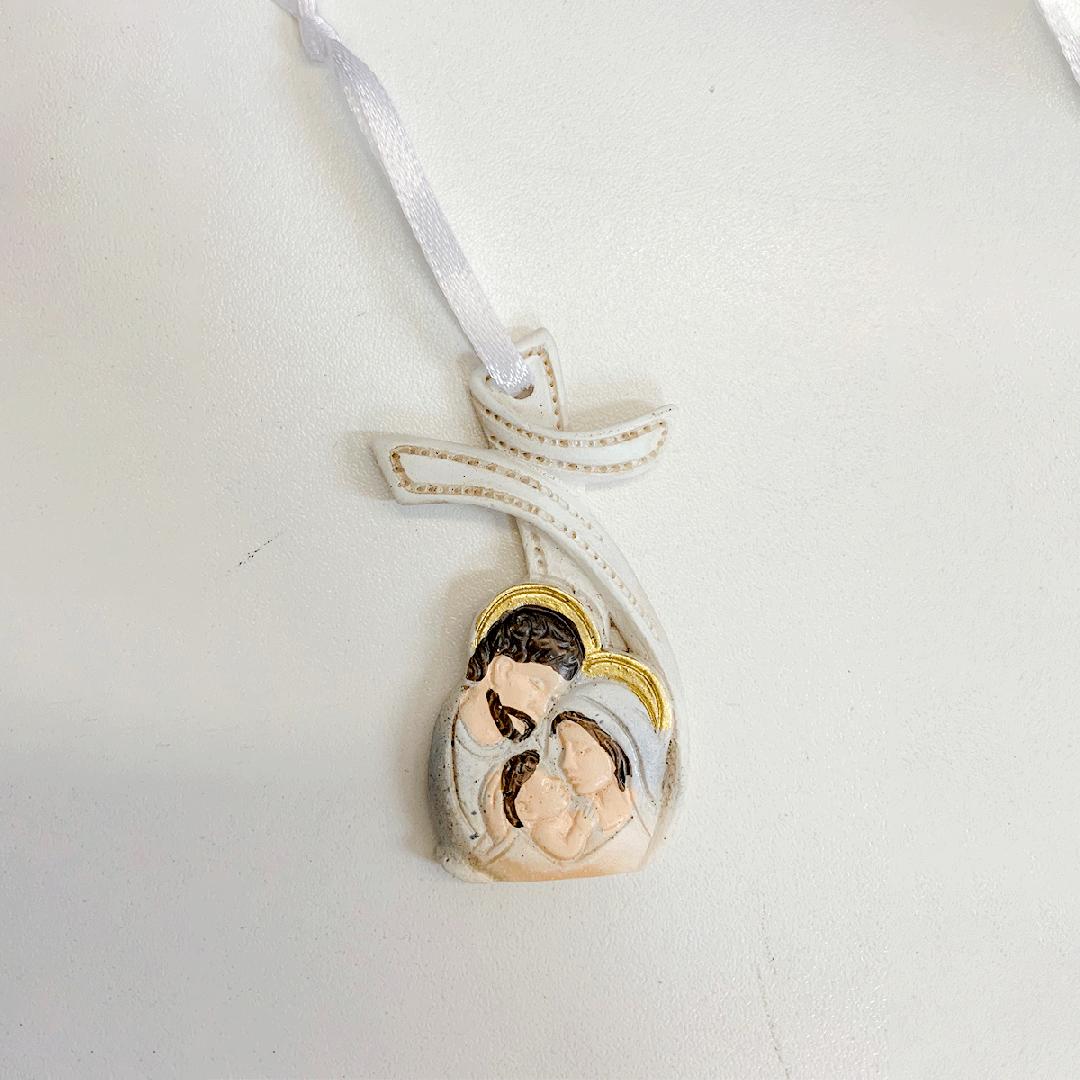 Ultimi 30 pezzi Bomboniere ciondolo croce con sacra famiglia con nastro, materiale resina decorata a mano, misura 3x h5 cm.