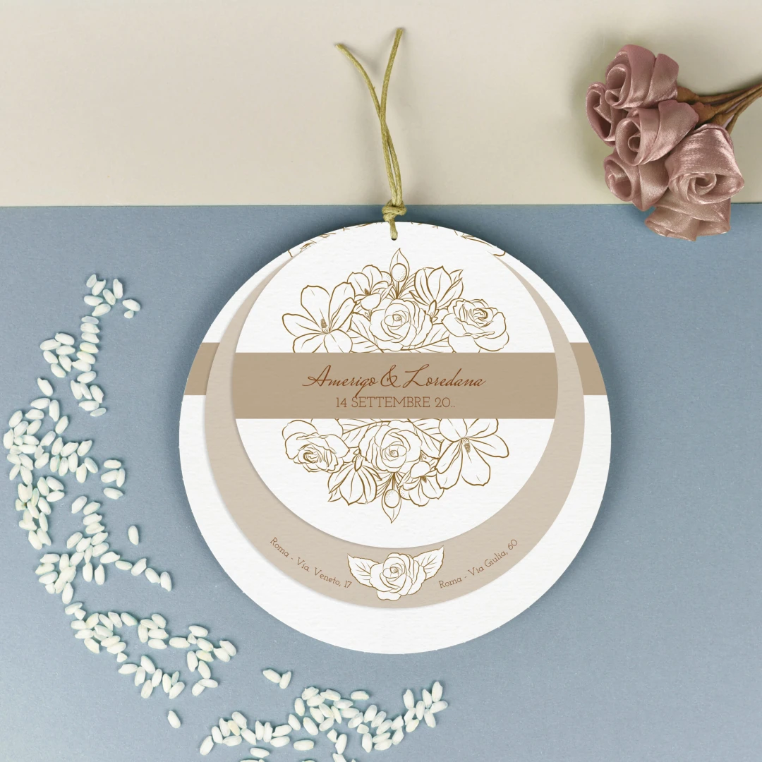 Partecipazione Nozze Originale, stampata su pregiata carta bianca goffrata Natural Evolution White 200 gr, il tutto sulle tonalità del beige impreziosito da decori floreali ed unito da un cordoncino colorato coordinato. misura partecipazione: 15 x 15 cm.