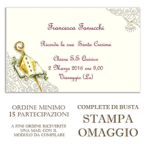 partecipazione, invito per cresima, modello 2, completa di busta, colore carta avorio, misura 13,5x8,5 cm,