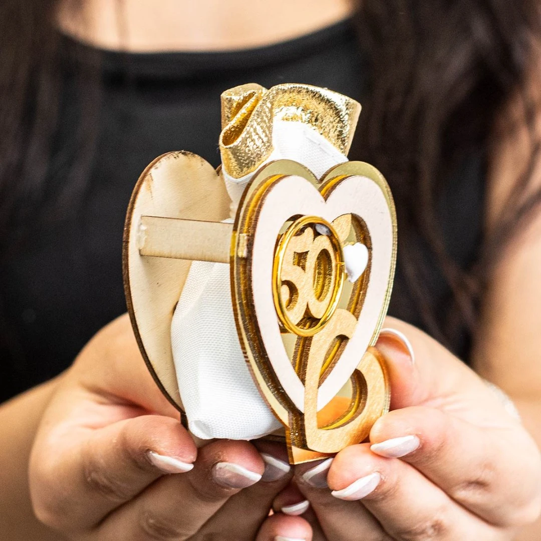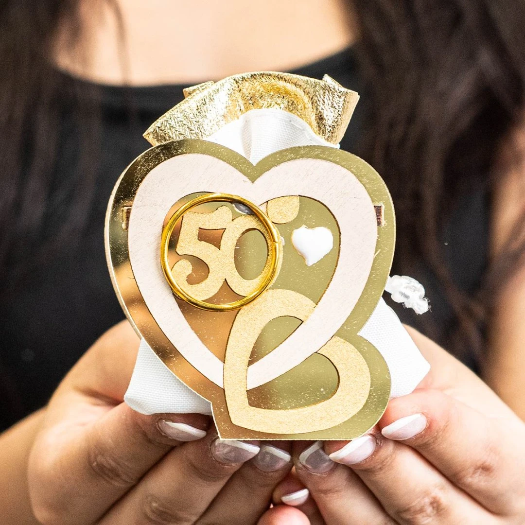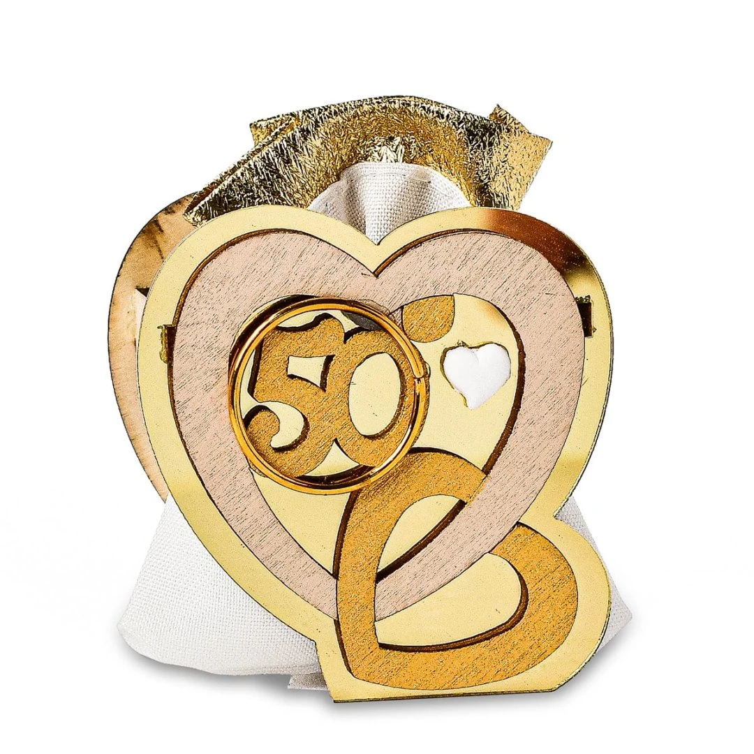 Celebra 50 anni d’amore con eleganza e significato grazie a questa splendida bomboniera per Nozze d’Oro. Realizzata in legno e plex dorato, presenta una raffinata composizione di cuori sovrapposti e il numero 50 in rilievo, simbolo dell’anniversario d’oro. Misura: 6 x 8 cm.