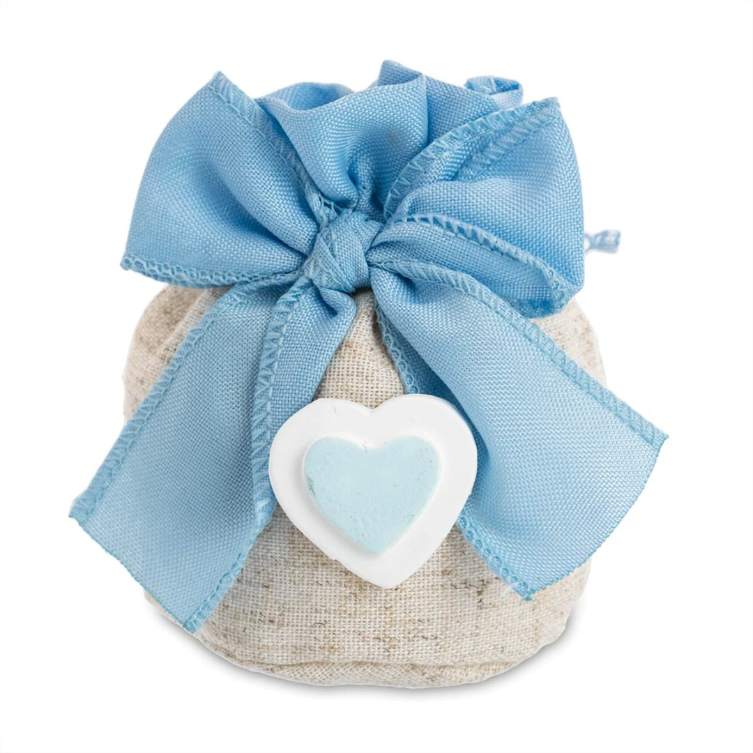 Sacchetti Porta-confetti in tessuto celeste con fiocco e doppio cuore in gesso. Completo di tirante di chiusura, scegli il modello tra: