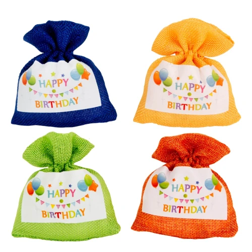 Bomboniere Compleanno, Linea Corda Birthday, Sacchettino portaconfetti in yuta colorata con grafica "Happy Birthday" piena di festoni e palloncini stampata su fronte. Il prezzo si riferisce ad 1 sacchettino. Prodotto Artigianale. Misura sacchettino: 12 cm. Arrivano assortiti in 4 colori. ( Giallo, Verde, Blu ed Arancione).
