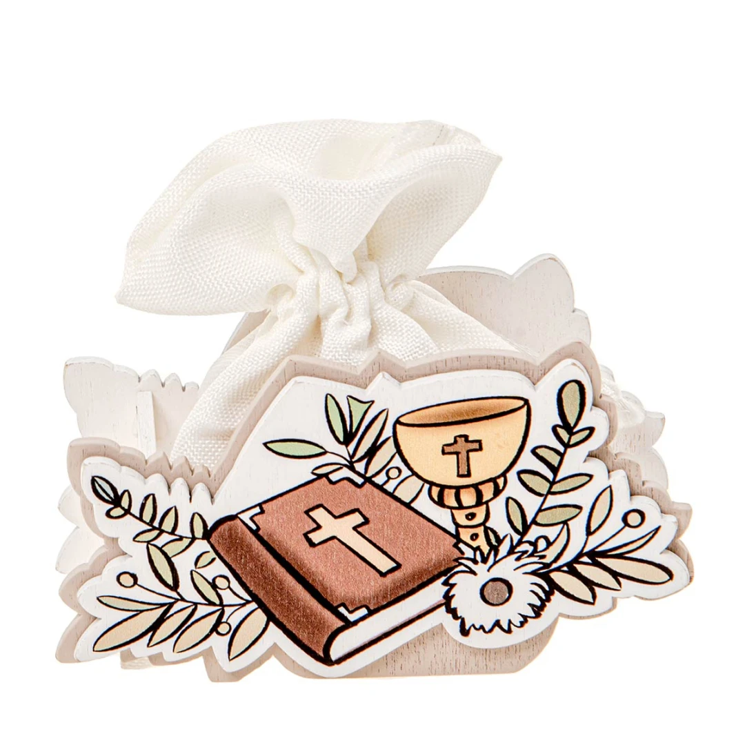 Bomboniere Comunione 2026, Linea Disegno, Scatolina portaconfetti in legno con disegno con libro e calice, inoltre all'interno presenta un sacchettino bianco. Prezzo cadauno. Prodotto Artigianale. Misura:8 x 3,6 cm | 8,5 cm circa.