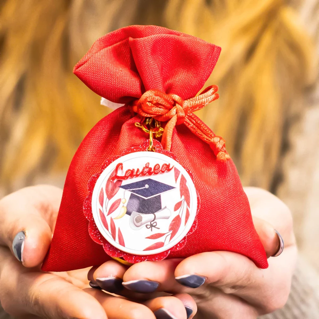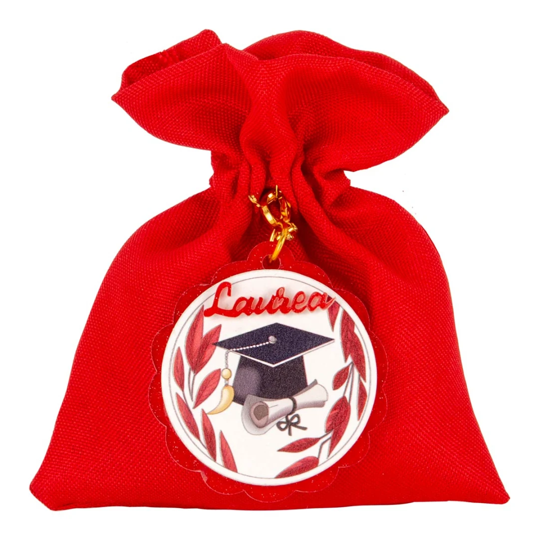 Bomboniere Laurea, Linea Cup, Sacchettino portaconfetti in tessuto rosso con portachiavi decorato con tocco. Il prezzo si riferisce ad 1 sacchettino. Prodotto Artigianale. Misura sacchettino: 10 x 12 cm.