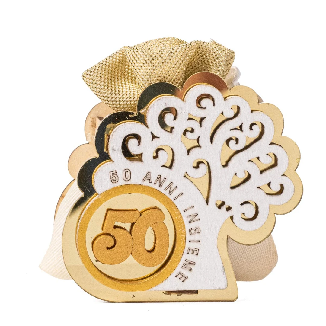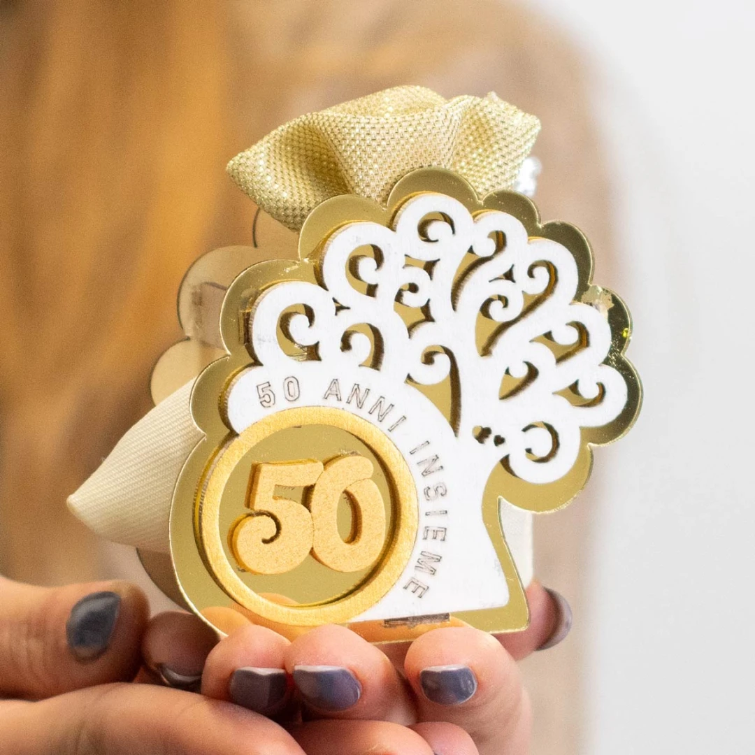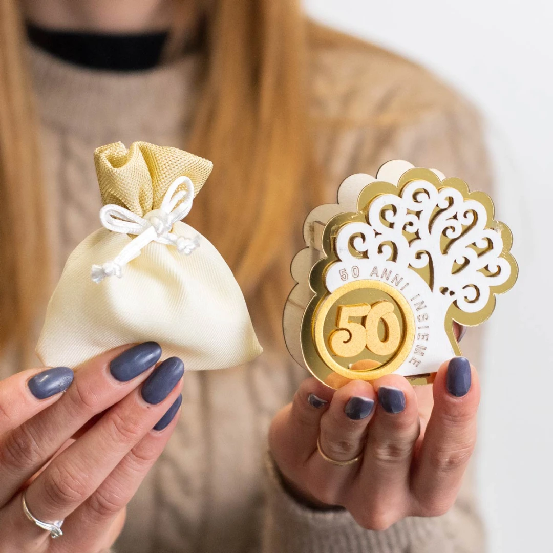 Bomboniere 50° Anniversario di matrimonio 2026, Linea Eternal, Scatolina portaconfetti in legno e plexiglass oro con albero della vita, numero 50 e frase, inoltre all'interno presenta un sacchettino bianco rifinito in oro. Il prezzo si riferisce ad 1 scatolina. Prodotto Artigianale. Misura: 8 x 8 x 3 cm.