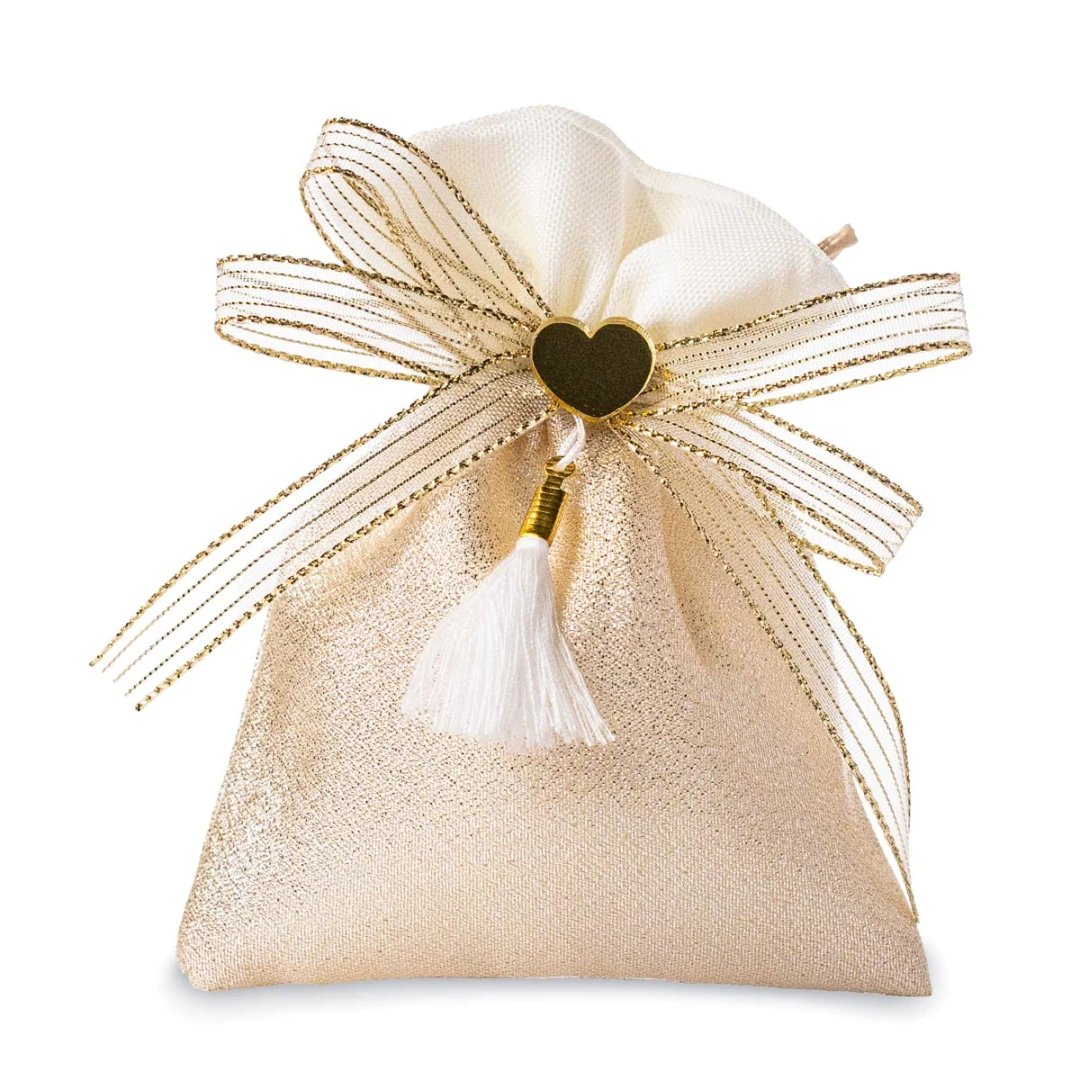 Bomboniere 2026 Nozze d'Oro Linea LIFE Sacchettini Portaconfetti dorato con nappina e cuore oro. Il prezzo si riferisce ad 1 sacchetto. Prodotto Artigianale. Misura: 9 x 12 cm.