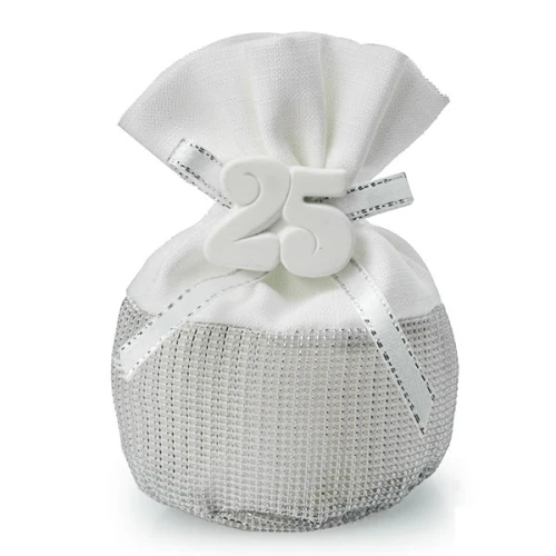 Bomboniere sacchettini portaconfetti per Nozze d'Argento, sacchettino tondo da 10 cm in tessuto argentato, numero 25 in gesso fiocco e tirante di chiusura.