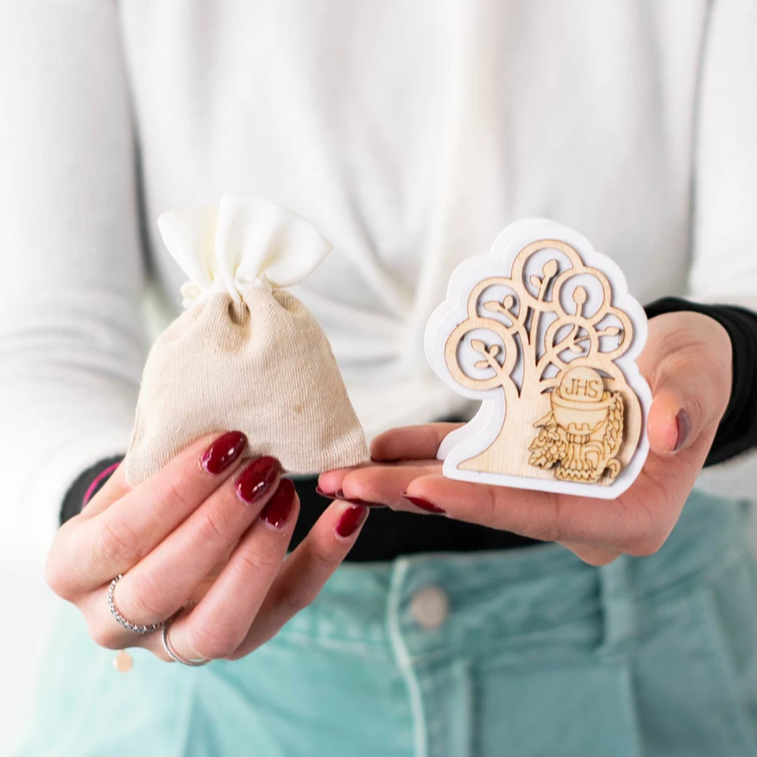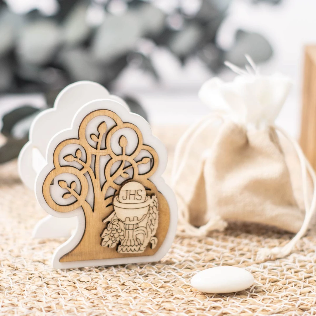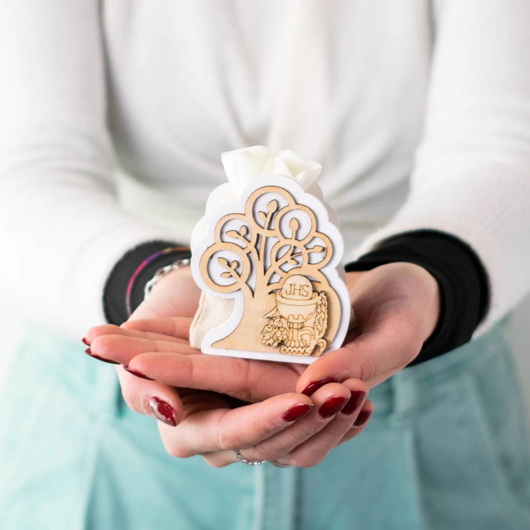 Linea di Bomboniere Comunione in OFFERTISSIMA 2026 Scatolina Porta-Sacchetto in legno forma di albero della vita, con Sacchetto Portaconfetti (con tirante di chiusura) e simbolo Comunione, misura 7 cm.