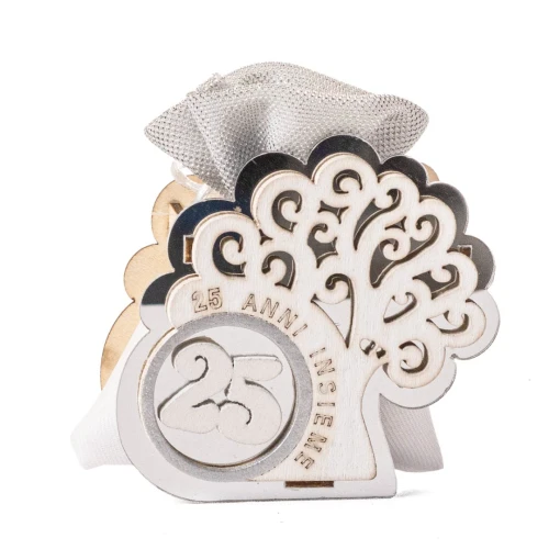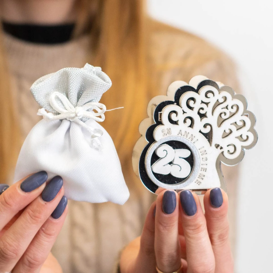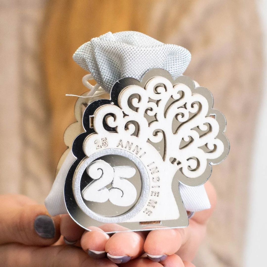 Bomboniere 25° Anniversario di matrimonio 2026, Linea Eternal, Scatolina portaconfetti in legno e plexiglass argento con albero della vita, numero 25 e frase, inoltre all'interno presenta un sacchettino bianco rifinito in argento. Il prezzo si riferisce ad 1 scatolina. Prodotto Artigianale. Misura: 8 x 8 x 3 cm.