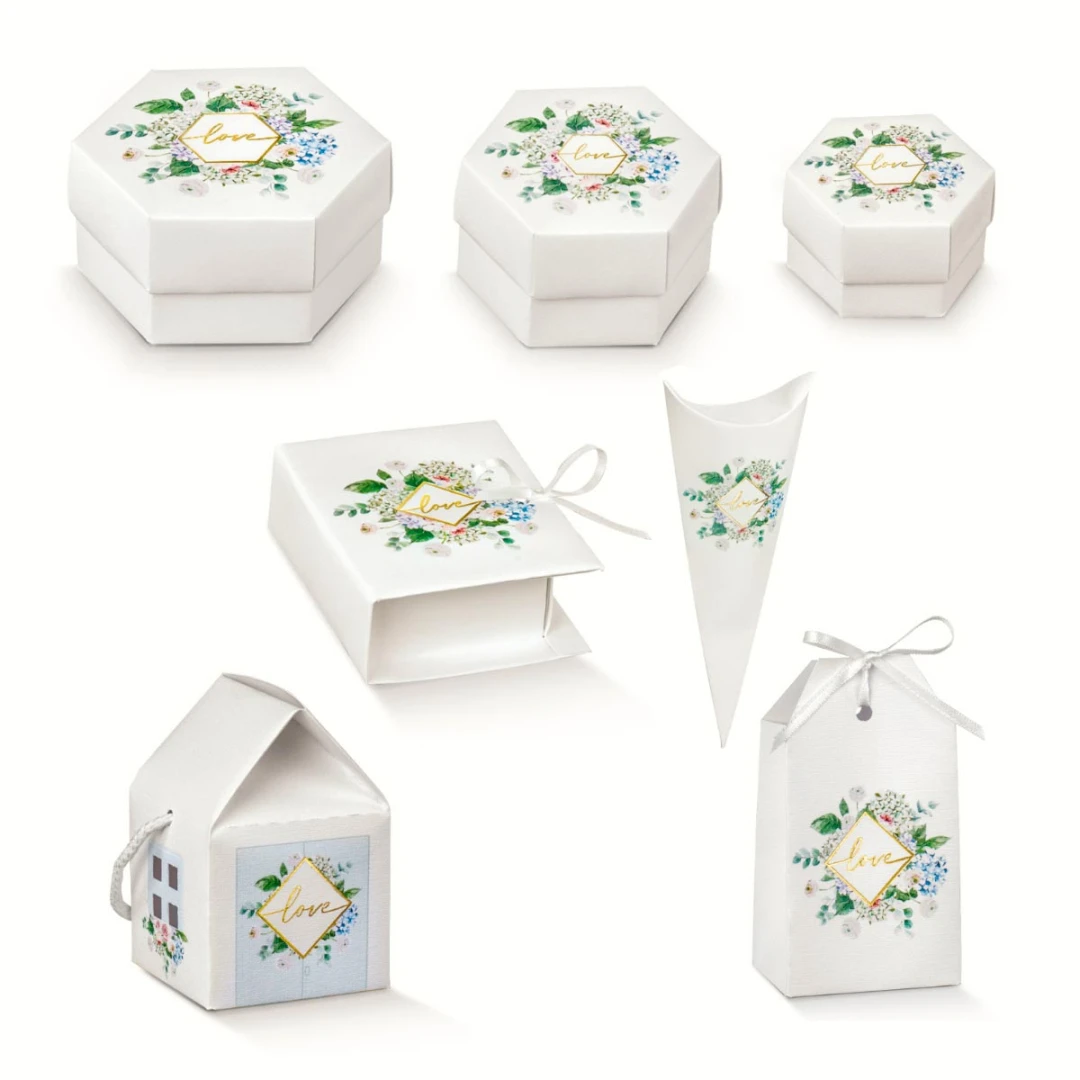 scatoline in cartoncino portaconfetti bianco con stampa Love dorato e decorazioni verdi, ideali per bomboniere da matrimonio, battesimo, nascita e tutte le altre cerimonie (i nastri sono compresi se selezionati nel kit o nella confezione).