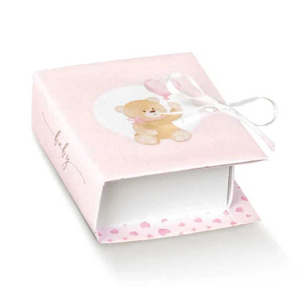 scatoline in cartoncino portaconfetti Rosa con Orsetto, ideali per bomboniere da battesimo o nascita di una bambina (i nastri sono compresi se selezionati nel kit o nella confezione).