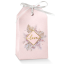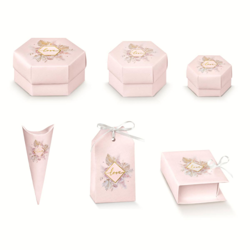 scatoline in cartoncino portaconfetti rosa con stampa Love dorato, ideali per bomboniere da matrimonio, battesimo, nascita e tutte le altre cerimonie (i nastri sono compresi se selezionati nel kit o nella confezione).