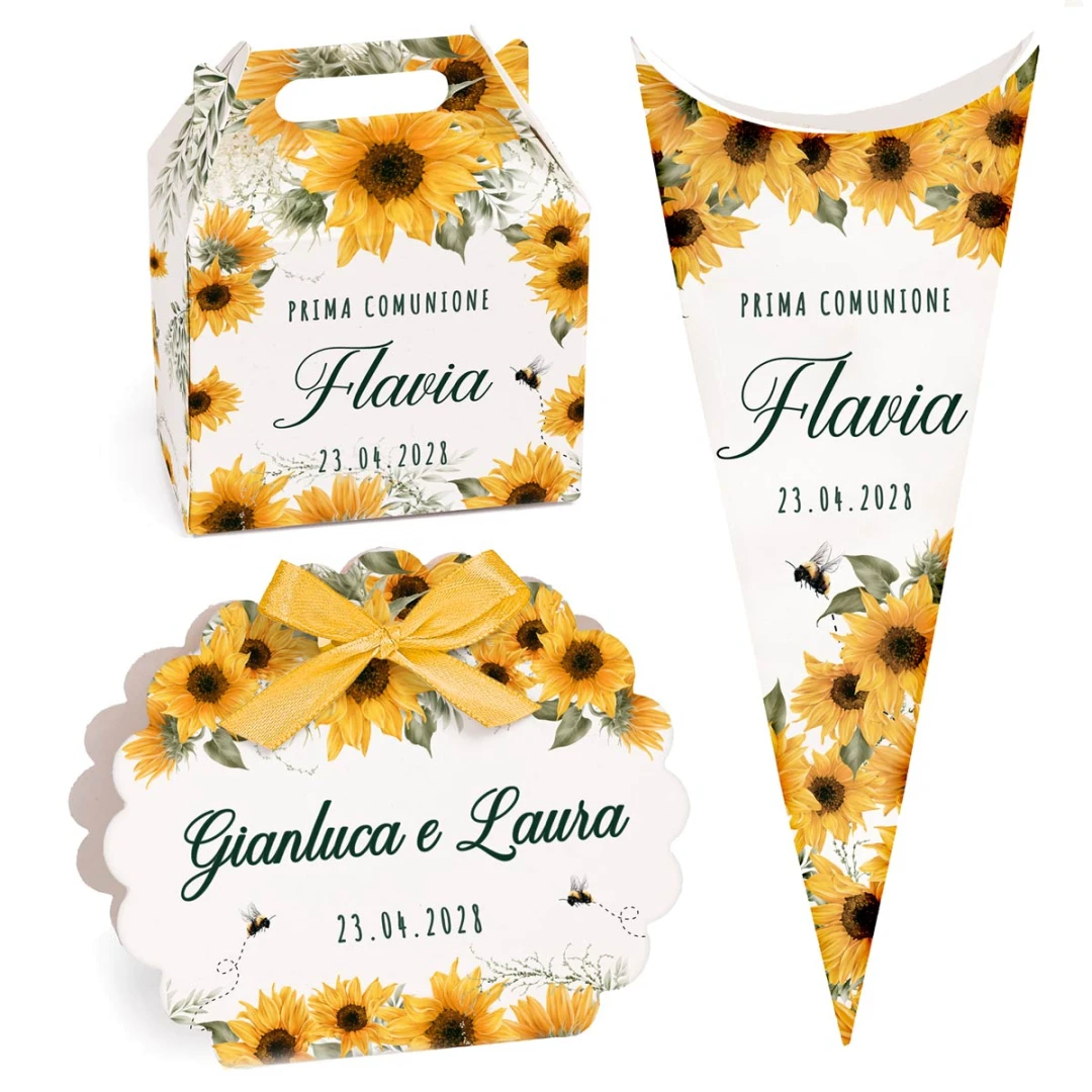 Scatoline Portaconfetti Personalizzabili adatte per tutte le cerimonie, con girasoli che circondano l'intera linea con foglie e api. (nastri non compresi).