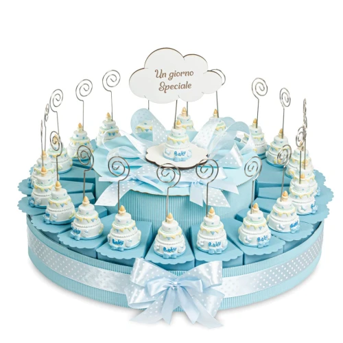 Torta di bomboniere completa di 20 Fette con tortine di compleanno celesti su ogni fetta, tortina centrale e nuvoletta con su scritto "Un giorno speciale" (che rimane al festeggiato), arriva con nastri e struttura come da foto. Misura: 39x25 cm. Altezza tortina: 10 cm.
