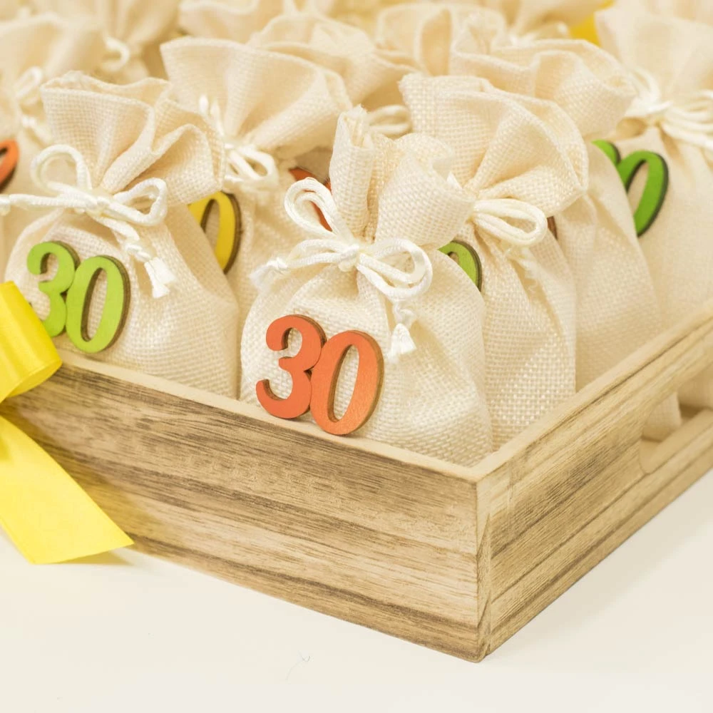 Bomboniere 30 Anni per compleanno, Struttura porta-bomboniere con 20 sacchettini portaconfetti in tessuto completi di tirante e numero in legno, la struttura è compresa di fiocchi e numero come da foto, idea originale per per ricordare questa bellissima tappa.. 30 anni di età!