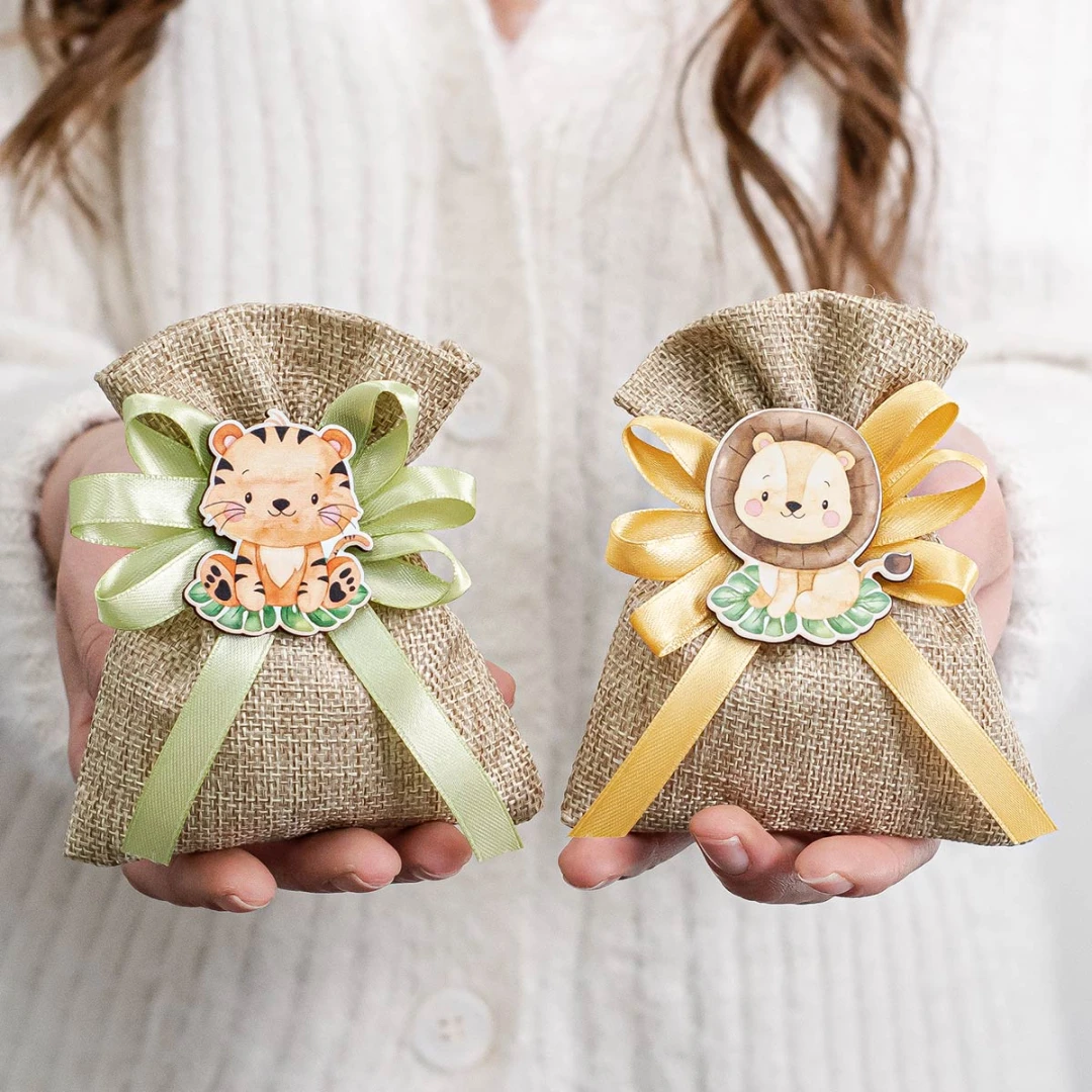 Torta di bomboniere completa di 20 sacchettini con animaletti della giungla misti tra cui, Leone, Tigre, Zebra, Elefante, Giraffa. sul retro presenta un panello con una splendida grafica degli animali della foresta sulla jeep. Arriva con nastri e struttura come da foto. Misura: 32x26 cm | h 35 cm. Misura sacchettino: 10x12 cm. | Misura Applicazione: circa 4/5 cm.