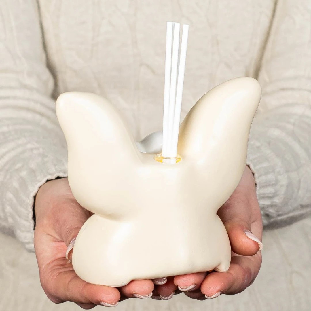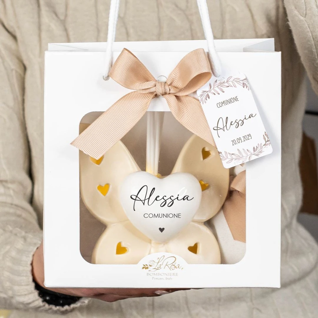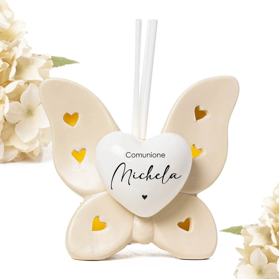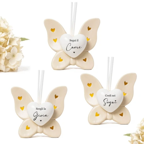 Bomboniera profumatore in ceramica beige a forma di farfalla con cuore centrale e piccoli intagli a cuore che lasciano filtrare una piacevole luce LED. Completo di 5 bacchette diffusore e profumo incluso alla fragranza talco, personalizzabile con scritte o testo, misura 12x6 h15 cm, batterie incluse.