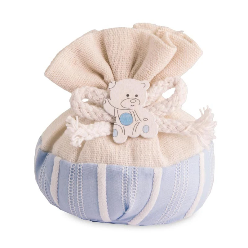 Bomboniere Sacchettini portaconfetti battesimo e nascita bimbo, linea Orsetto Celeste per Maschietto, idea originale per la confettata, segnaposto e bomboniera per la festa della tua Bambino, è adatta anche come bomboniera baby shower. i sacchetti sono in tessuto misto Cotone Azzurro e juta grezza, completo di fiocco, orsetto e tirante di chiusura.